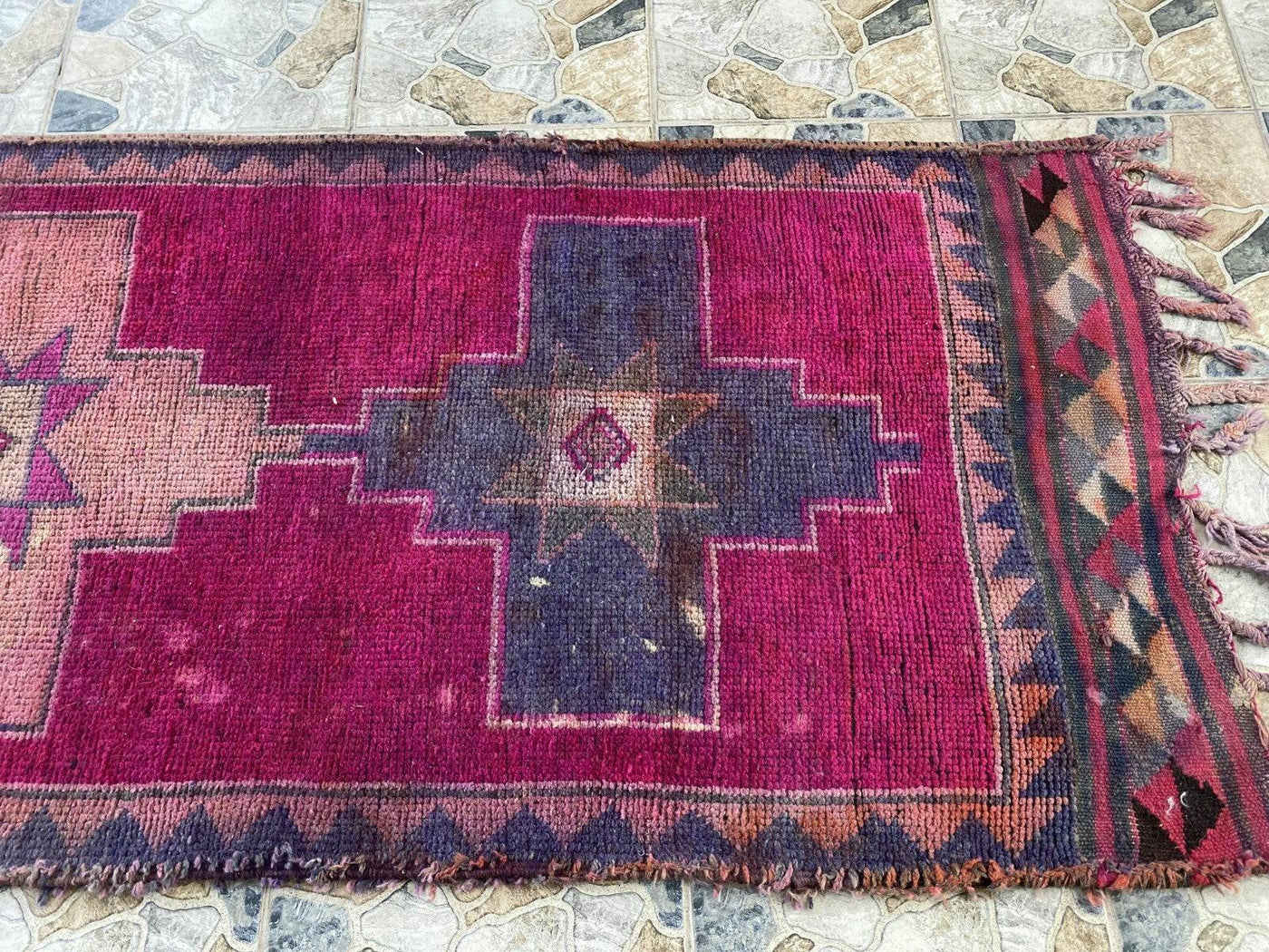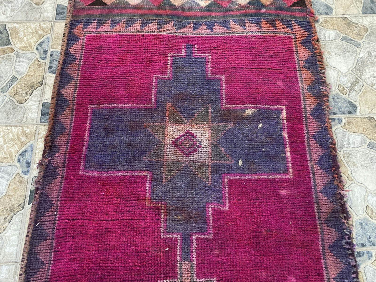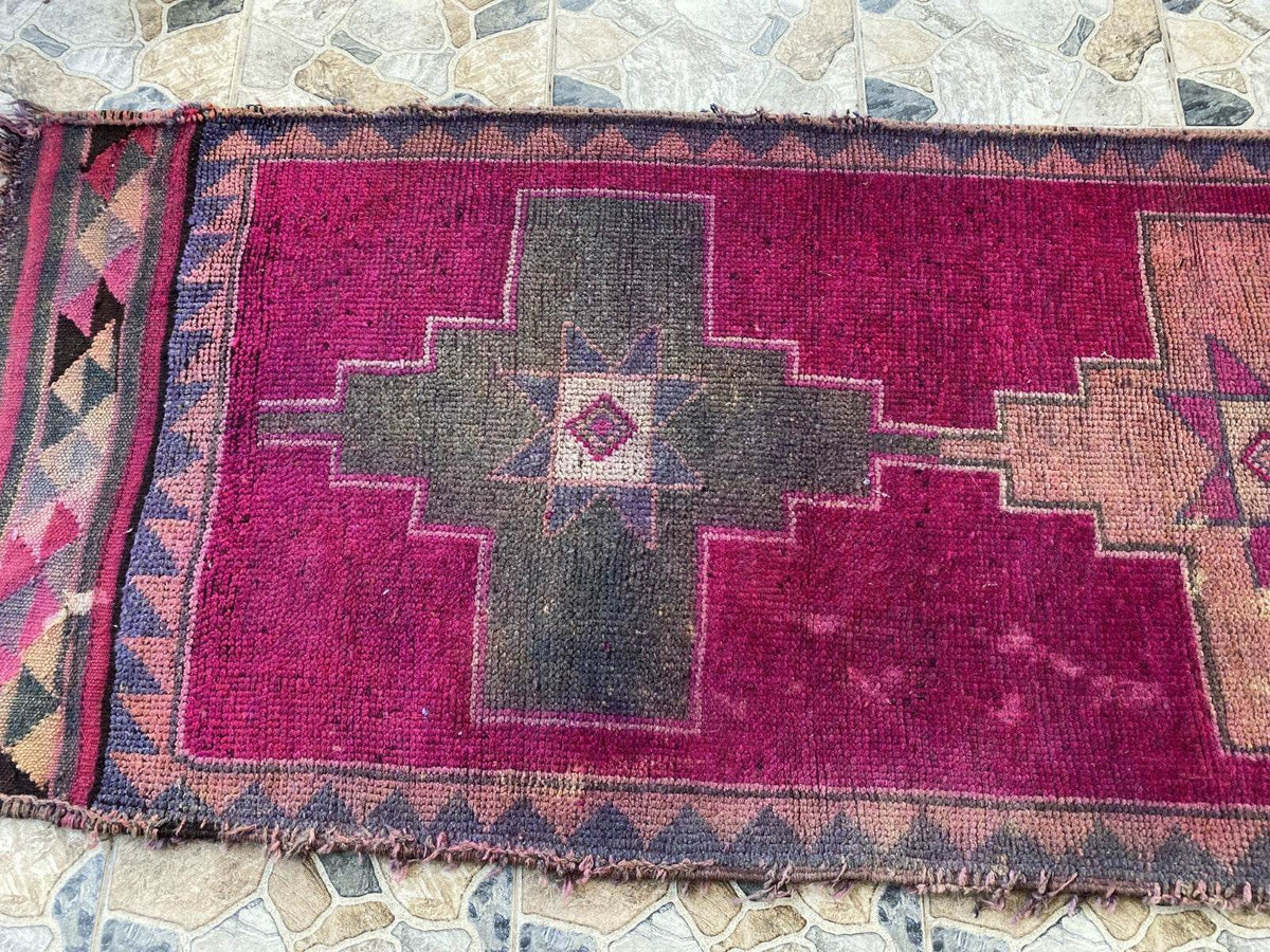 This Kurdish vintage runner rug, handmade in the 1960s, is a true reflection of timeless tribal craftsmanship. Woven with 100% wool, it features bold geometric patterns and a striking color palette of deep magenta, charcoal gray, earthy browns, and subtle pinks. Ideal for farmhouse-style interiors, it enhances any space with its authentic antique charm. The rug has natural wear and tear from its use over the years, and minor repairs have been done to preserve its beauty and durability.