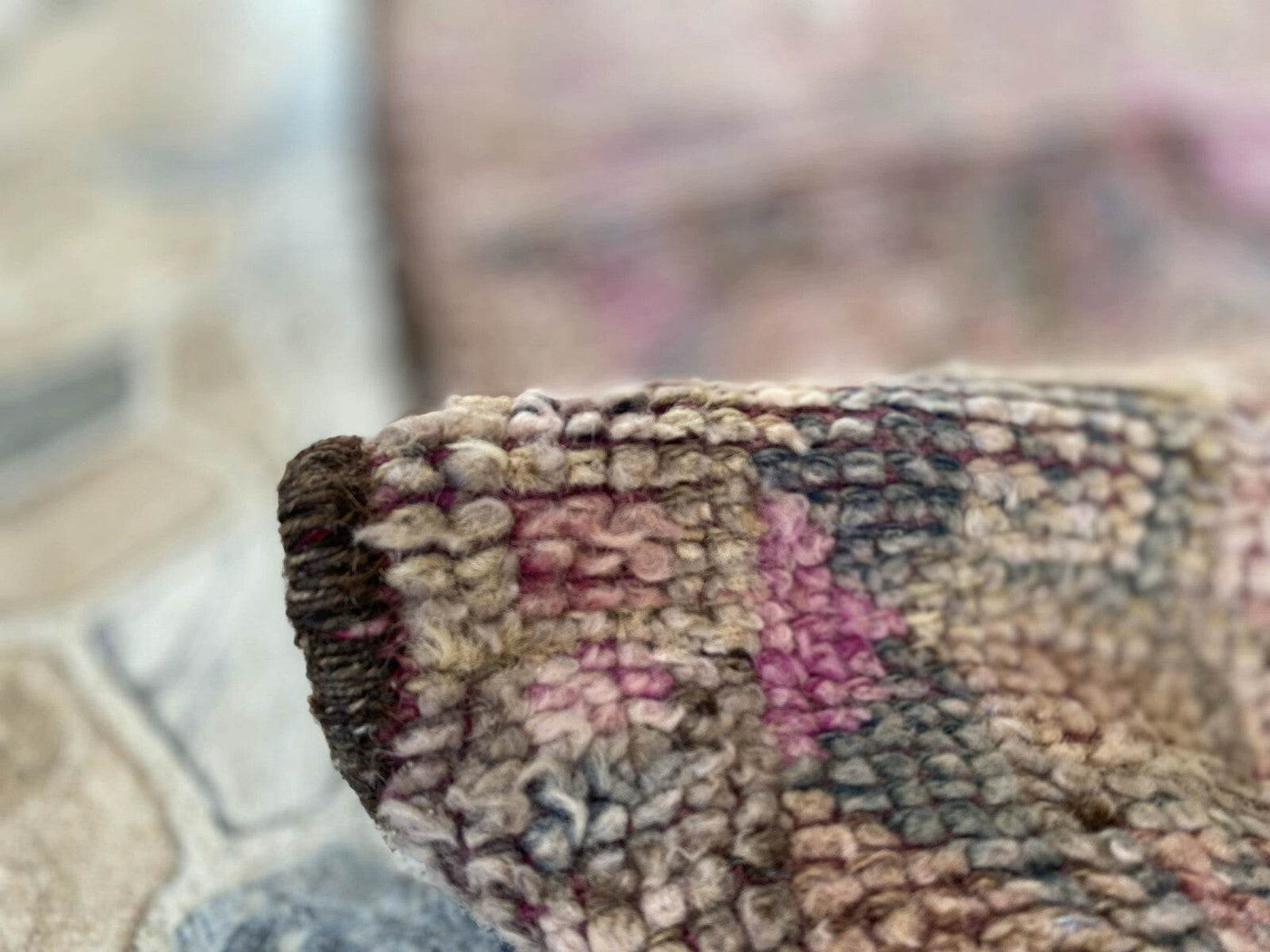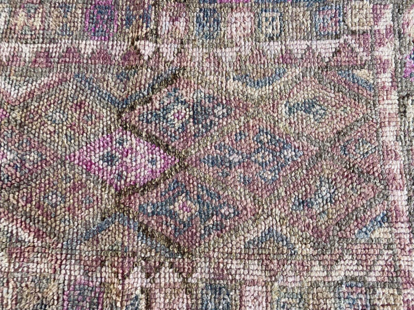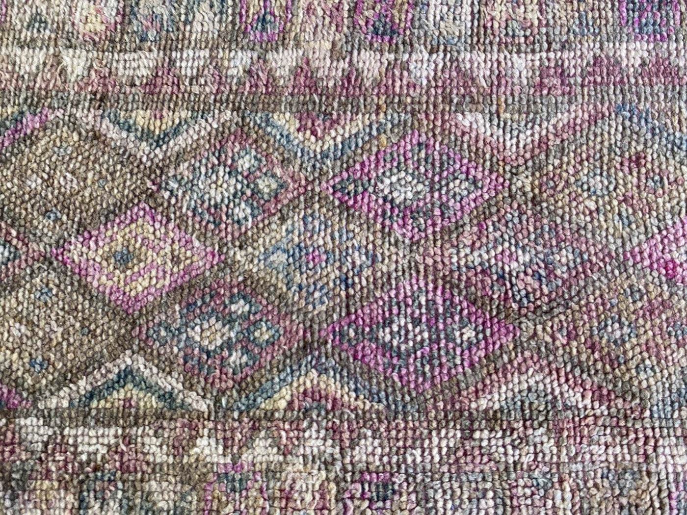 The rug showcases a harmonious blend of soft pinks, purples, earthy browns, and muted greys, colors that evoke the serene landscape of rural Anatolia. These tones represent nature, with pinks symbolizing love and life, while browns and greys embody the earth and wisdom. The central design features geometric diamonds, a motif that signifies protection and good fortune in Turkish culture. These diamonds are often seen as a symbol of the evil eye, believed to ward off negative energies.