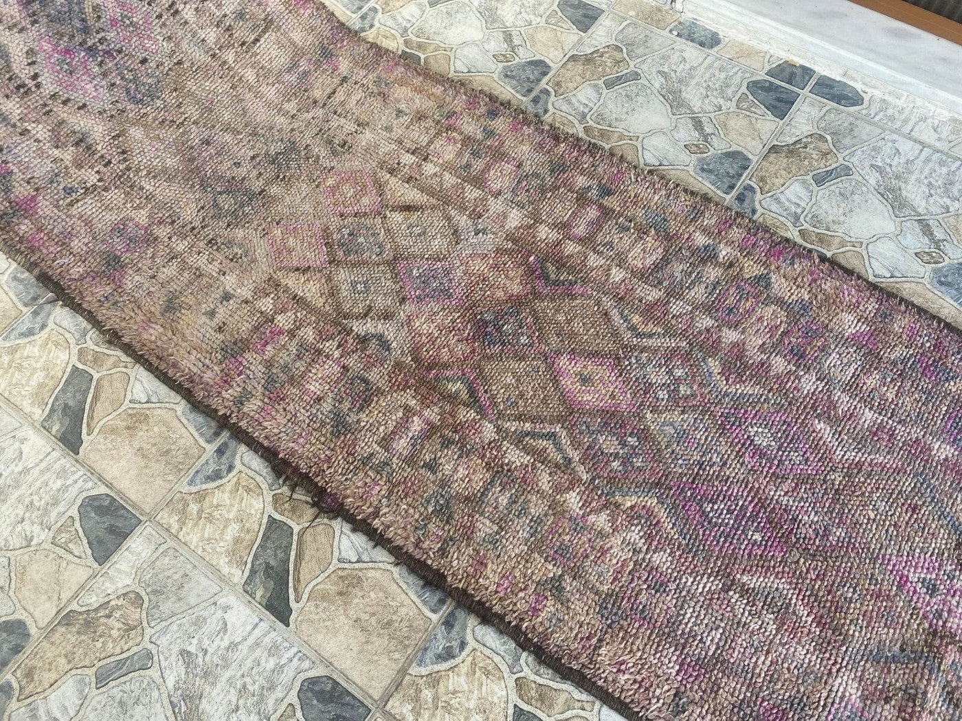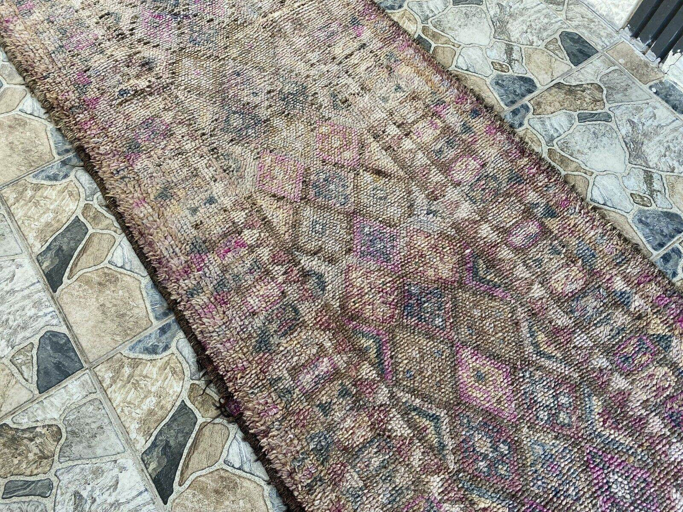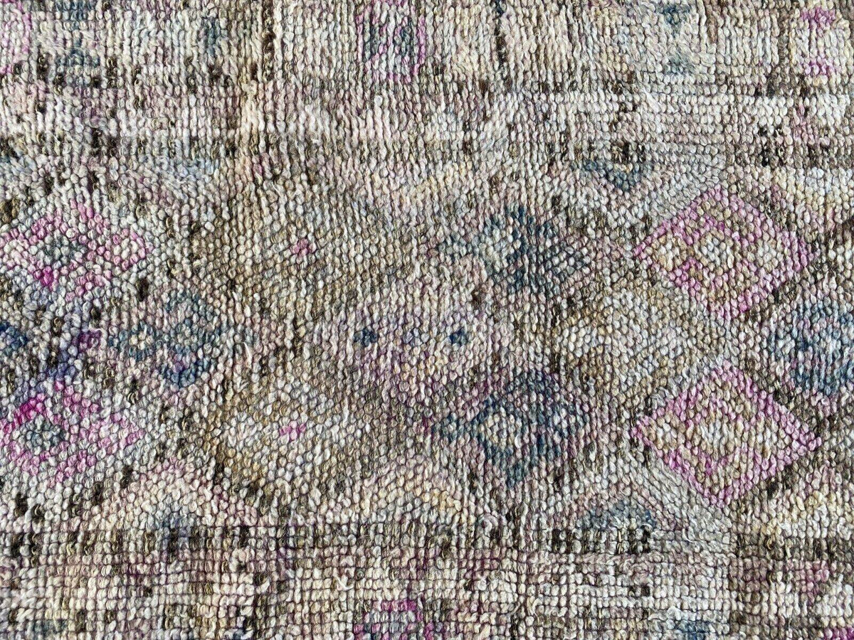 The rug showcases a harmonious blend of soft pinks, purples, earthy browns, and muted greys, colors that evoke the serene landscape of rural Anatolia. These tones represent nature, with pinks symbolizing love and life, while browns and greys embody the earth and wisdom. The central design features geometric diamonds, a motif that signifies protection and good fortune in Turkish culture. These diamonds are often seen as a symbol of the evil eye, believed to ward off negative energies.