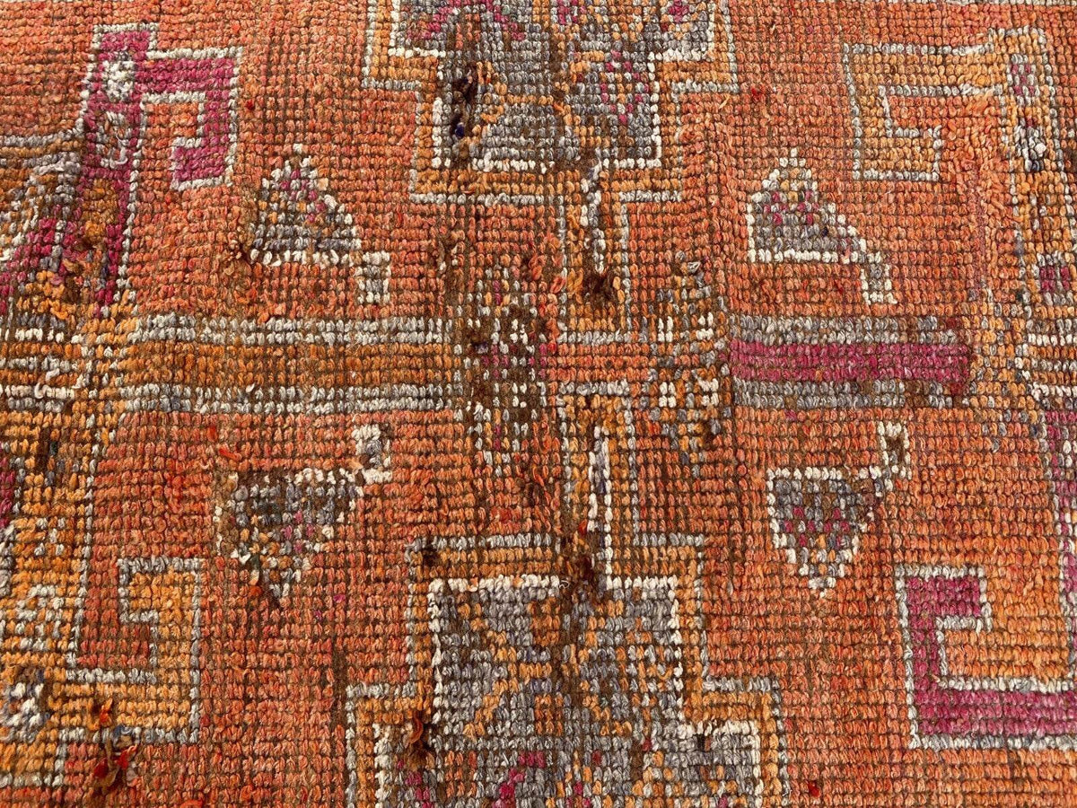 This antique rug has been lovingly preserved. Due to its age, there are minor signs of wear consistent with its history, including small repairs that have been skillfully done to maintain its integrity and aesthetic. Such imperfections only enhance its character and authenticity.