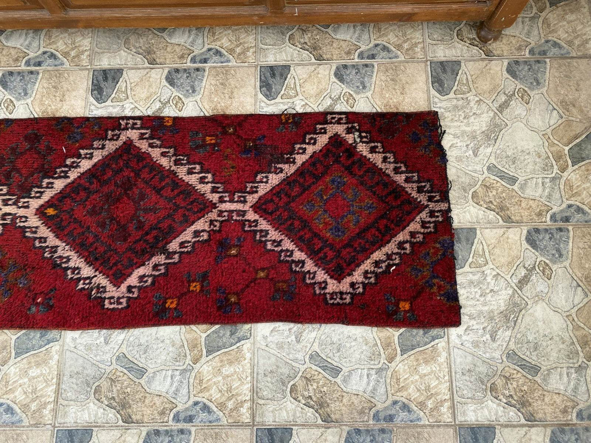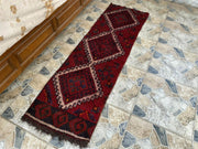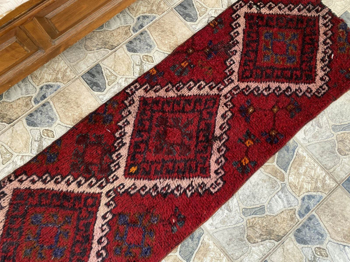 Enhance your space with this authentic 1970s vintage Kurdish runner rug, a handcrafted wool masterpiece that exudes timeless beauty and cultural significance. Measuring 1ft 9in x 5ft 6in (55 x 169 cm), this tribal red carpet is enriched with geometric diamond patterns and bold borders, symbolizing protection and prosperity in Kurdish tradition.