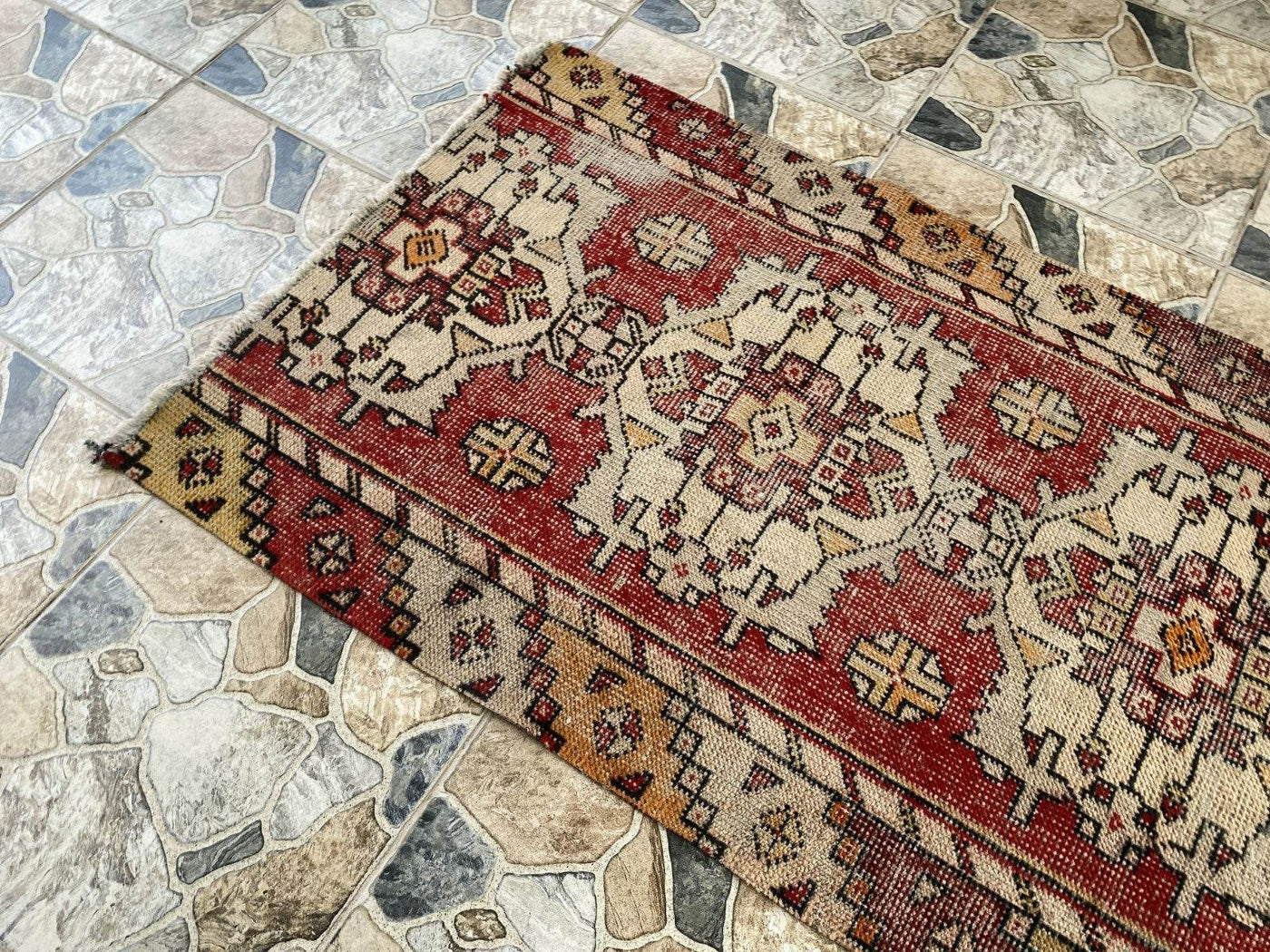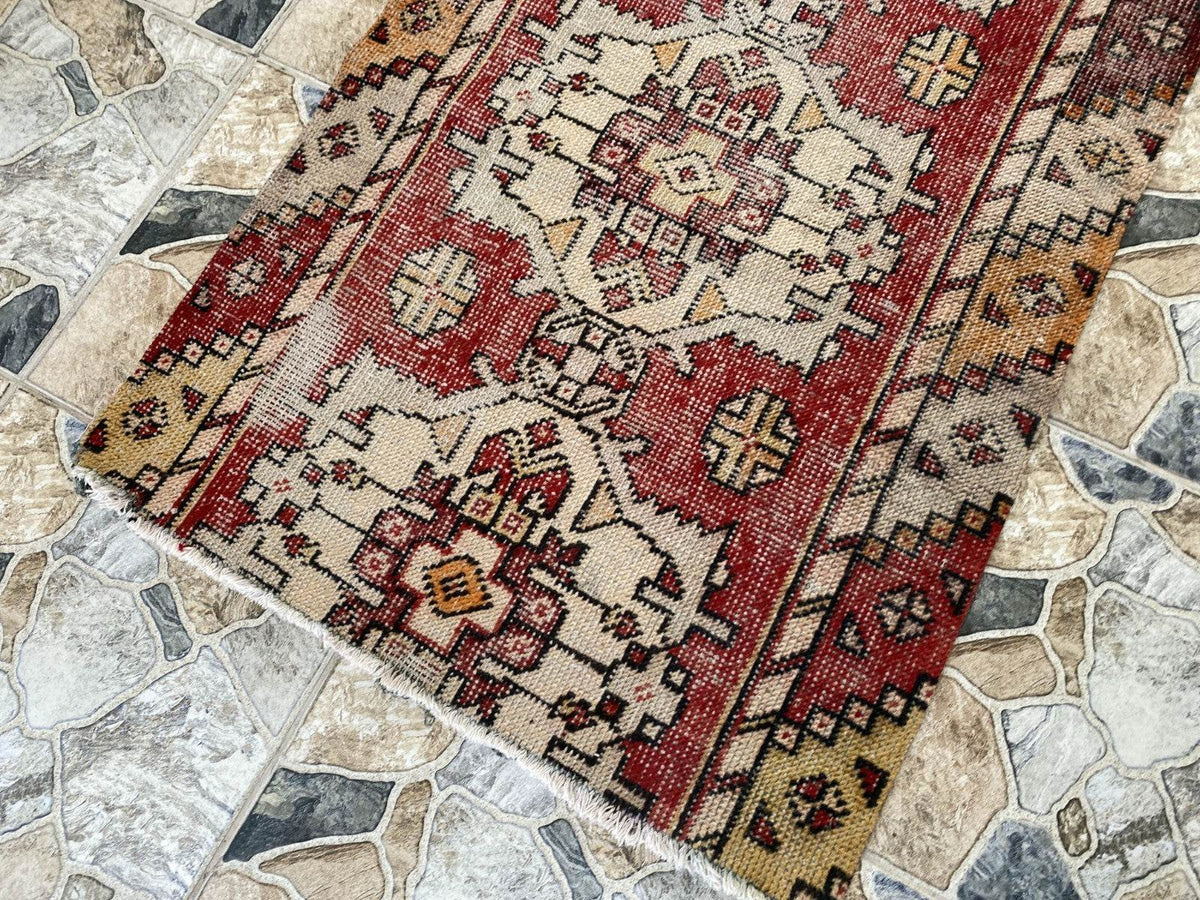 🎨 Design & Color Palette: Distressed Tribal Geometry This runner rug features a repeating geometric tribal pattern with a series of distinct medallions. The color palette is defined by distressed red and beige/cream, with contrasting accents of muted yellow and black, creating a soft and harmonious visual appeal. The worn appearance and faded colors give this rug its undeniable vintage charm and character.