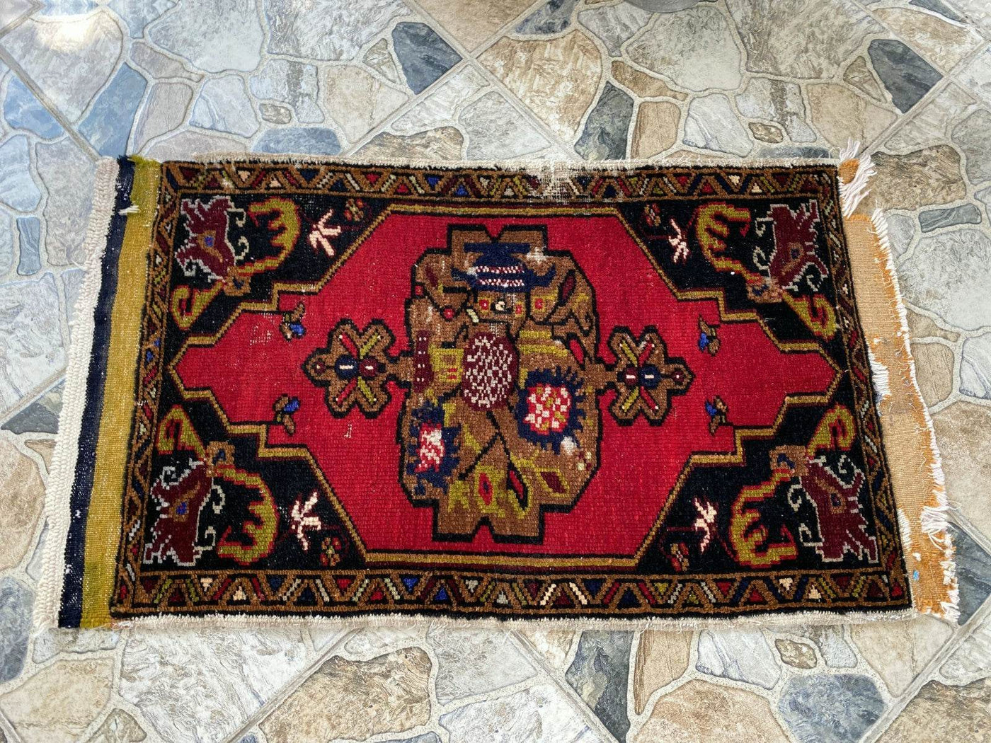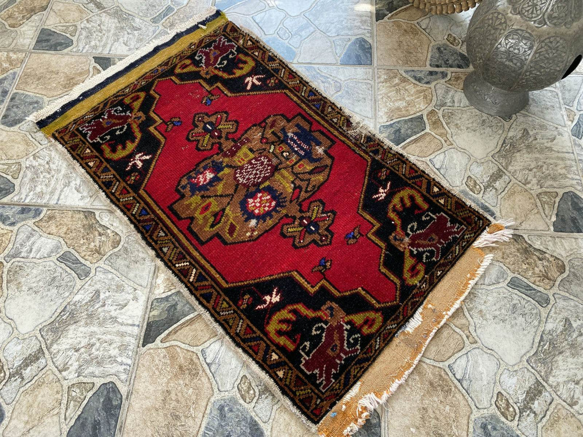 🔑 Tags / Keywords: Small vintage rug, Hand-knotted wool, Anatolian rug, Distressed rug, Faded colors, Geometric medallion, Shabby-chic decor, Bohemian rug, Accent rug, Unique vintage.