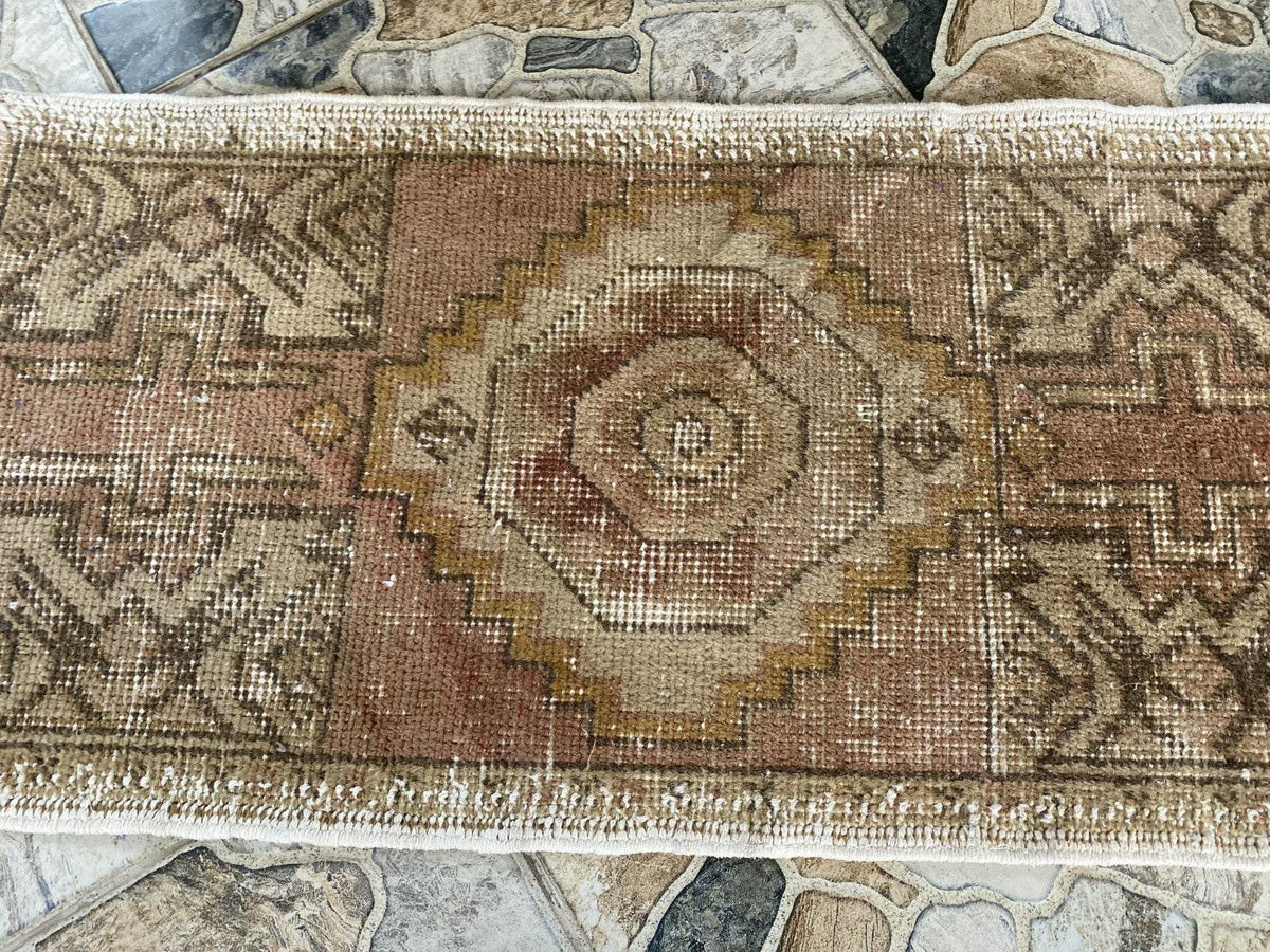 🔑 Tags / Keywords: Vintage Turkish rug, Hand-knotted wool rug, Distressed accent rug, Tribal geometric rug, Bohemian decor, Farmhouse rug, Rustic home decor, Small runner rug, Anatolian carpet, Antique style rug, Entryway rug, Bedside rug, Kitchen mat, Handwoven textile, Unique vintage find, Brown rug, Beige rug, Muted tones.