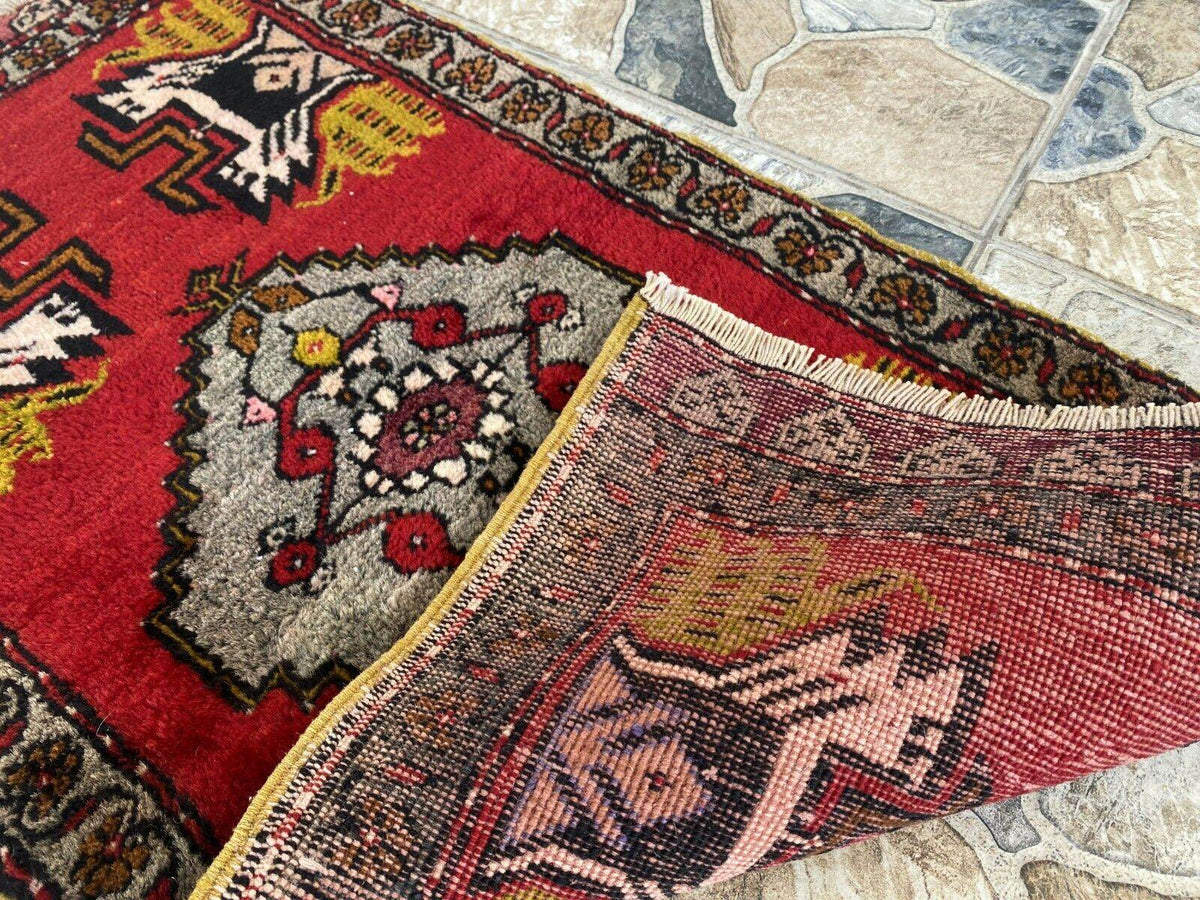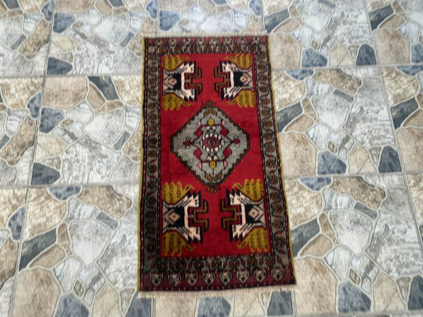 Experience the elegance and tradition of Turkish textile artistry with this vintage handmade Anatolian rug. Woven with hand-spun wool and natural dyes, this authentic Turkish small wool rug reflects the rich culture and heritage of Central Anatolia. Its antique tribal design, bold motifs, and symbolic color palette bring timeless beauty into any space.