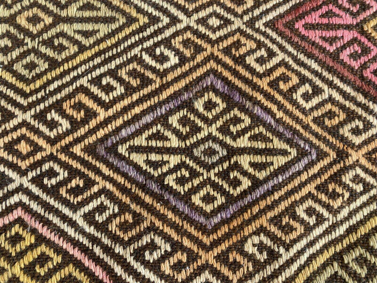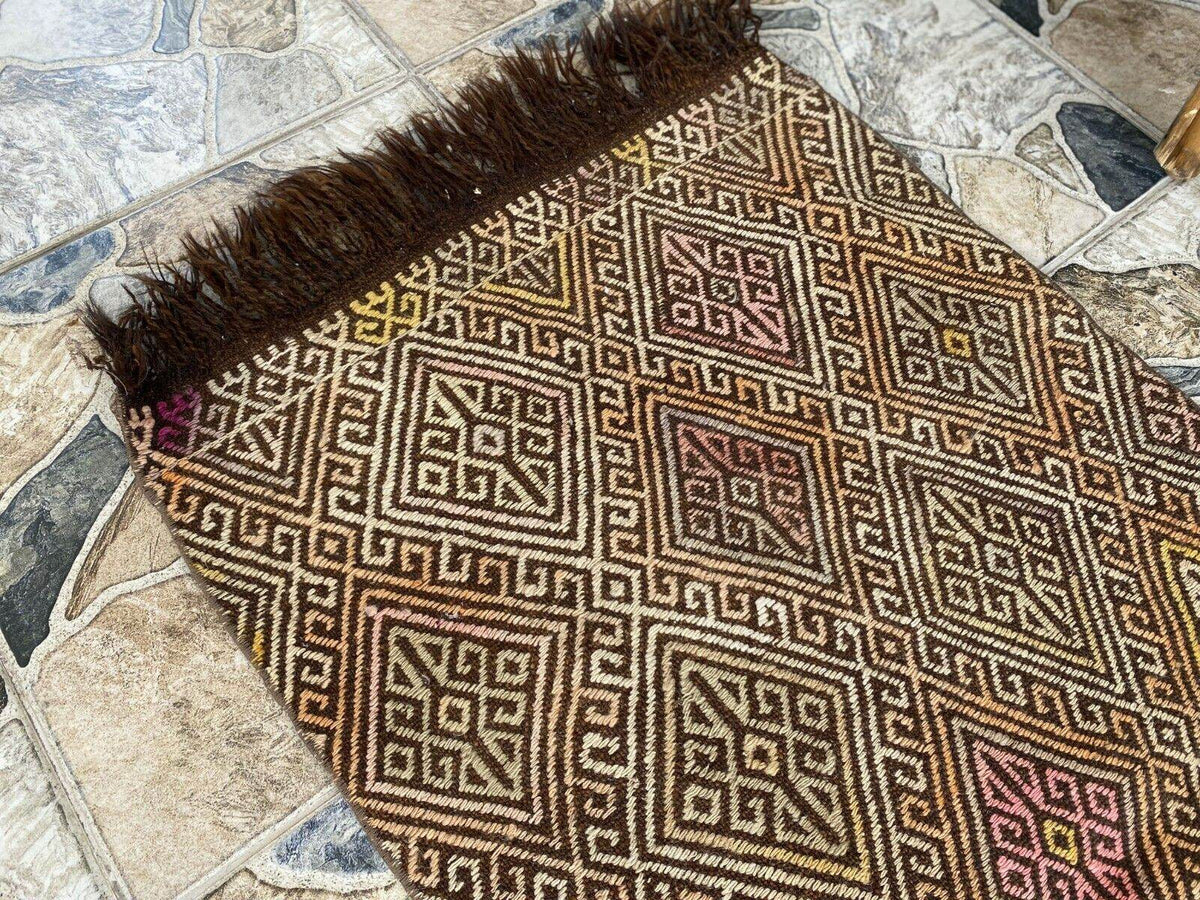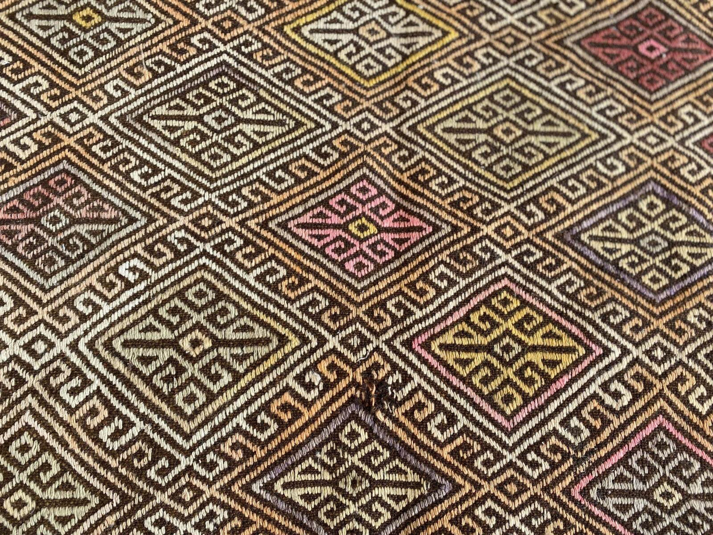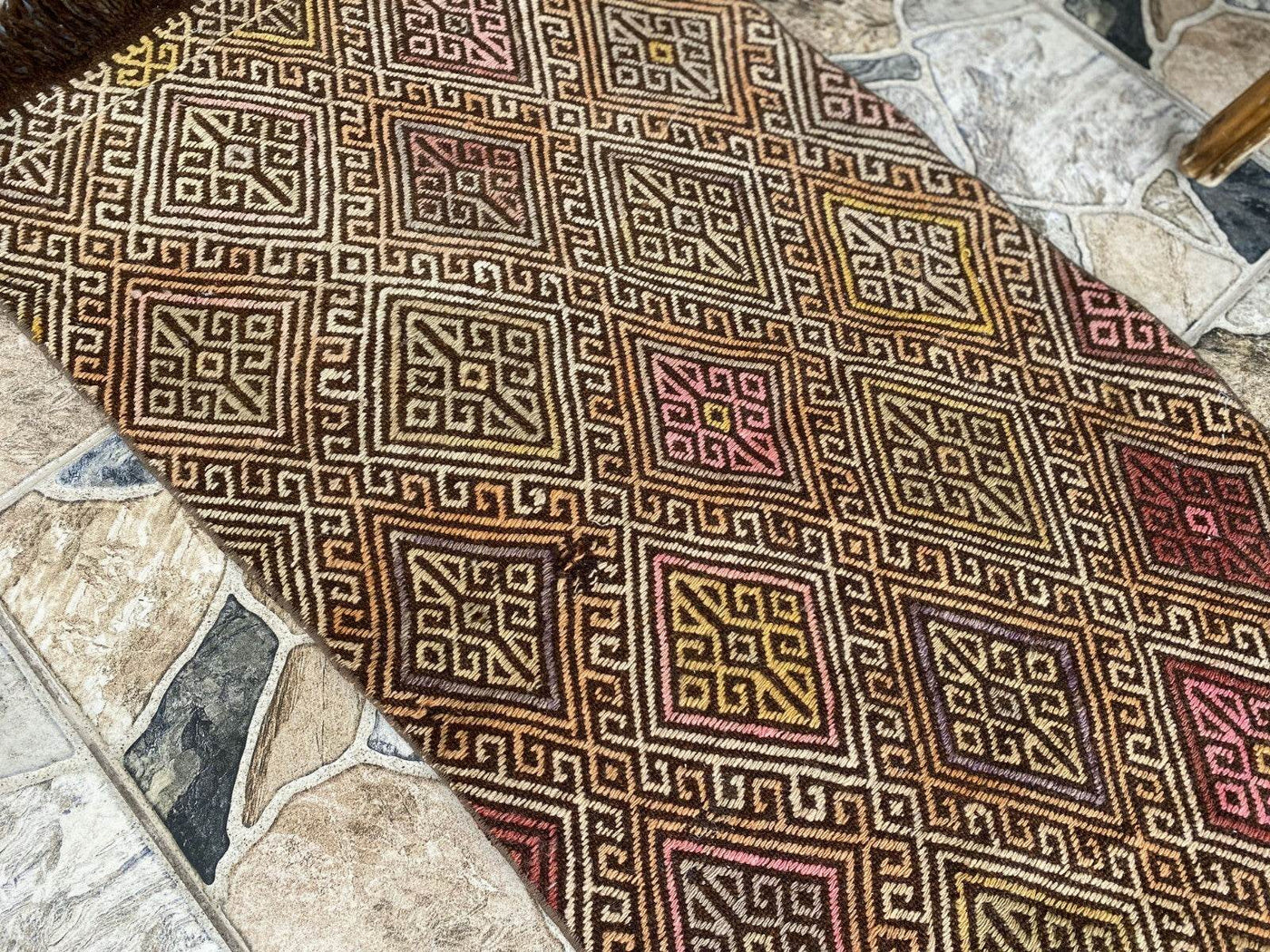 Enhance your home with this Vintage Turkish Oushak Kilim Rug, a stunning example of antique craftsmanship. Handwoven from 100% natural wool, this rug features a rich blend of deep red and earthy brown tones, accented by intricate tribal patterns that embody the essence of traditional Turkish design.