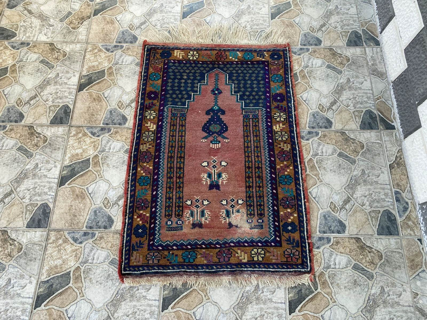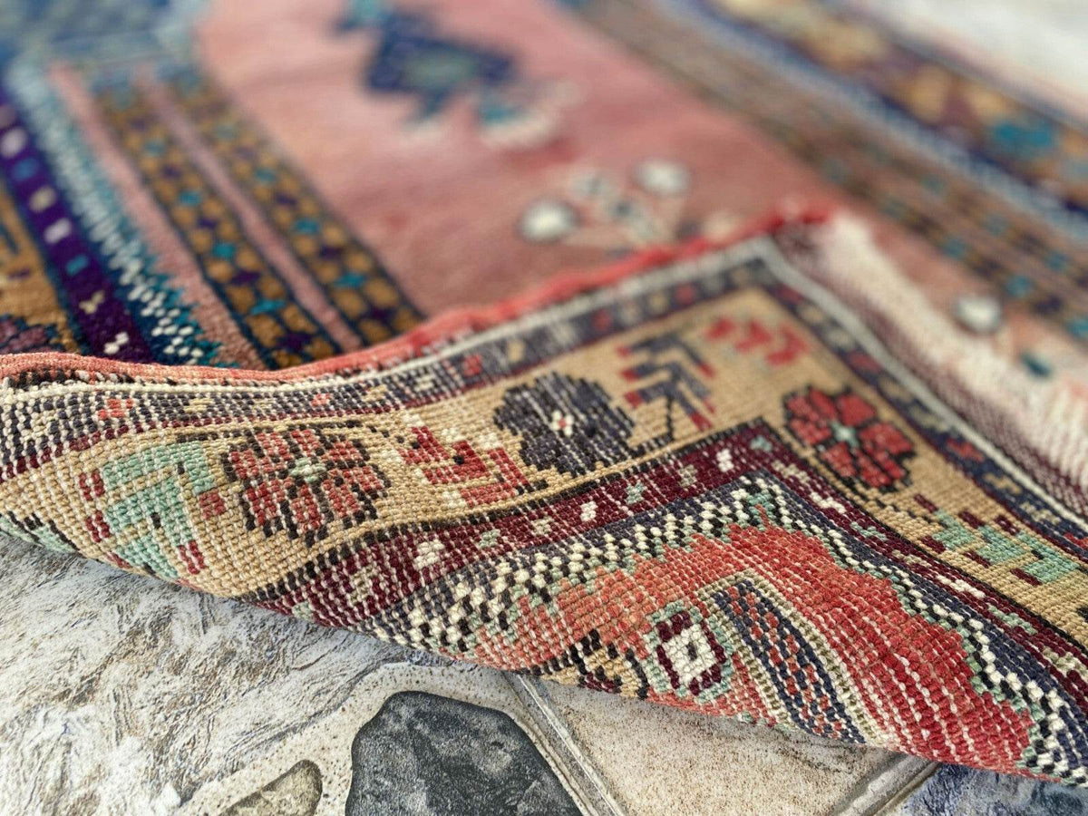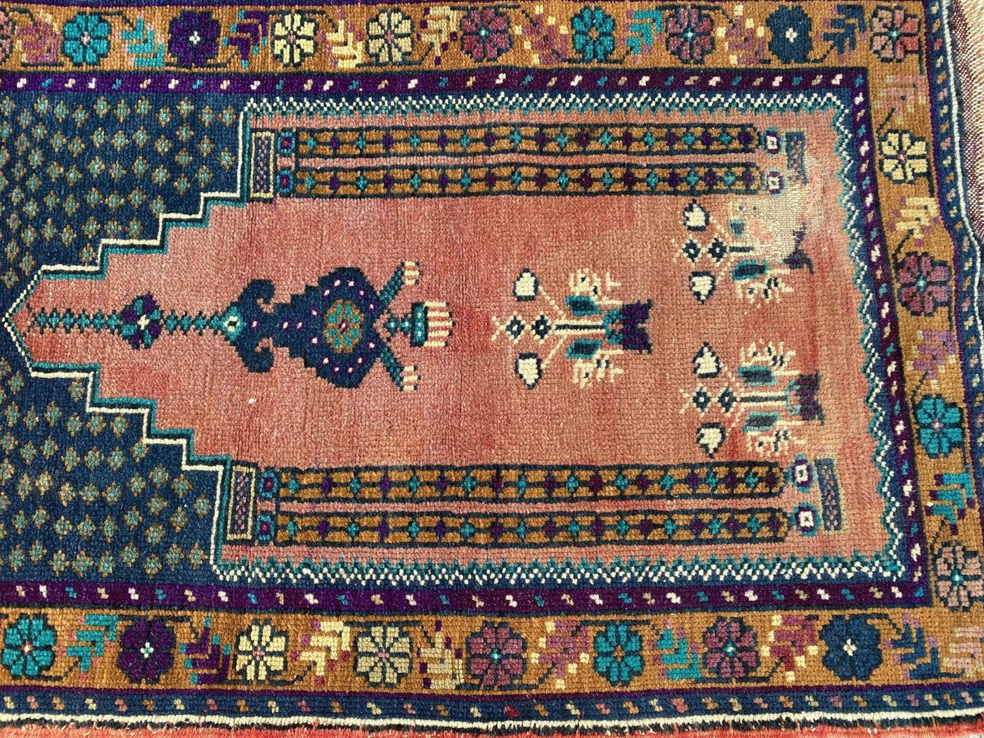 This handmade Turkish Oushak rug is a timeless masterpiece, measuring 2.39 ft x 3.51 ft. Carefully woven with 100% wool, it showcases the artistry of traditional Turkish weaving techniques, cherished for centuries. This charming vintage rug features a soft terracotta field with accents in deep blue, navy, and rich purple. The frame showcases a vibrant multicolor floral border, with hues of teal, mustard, cream, and burgundy, creating a balanced and lively appearance.