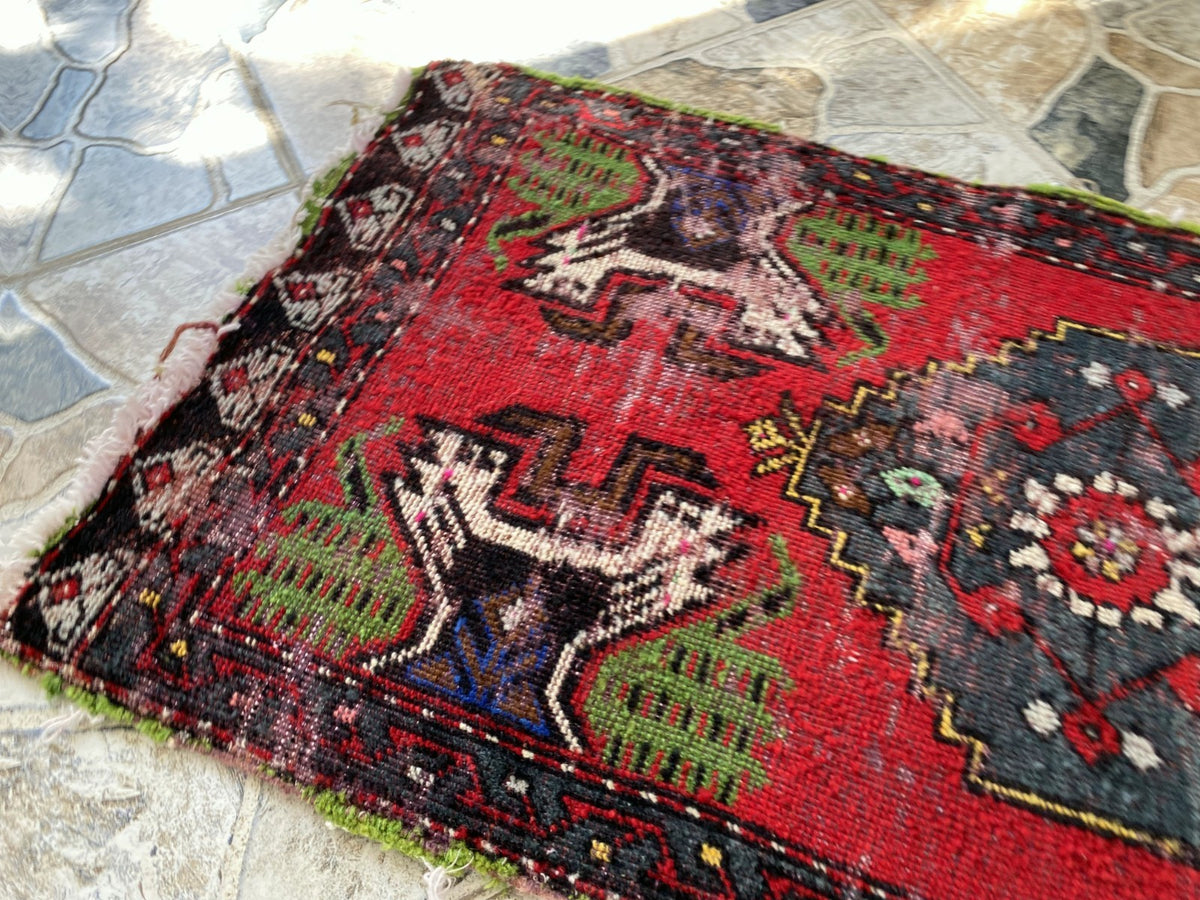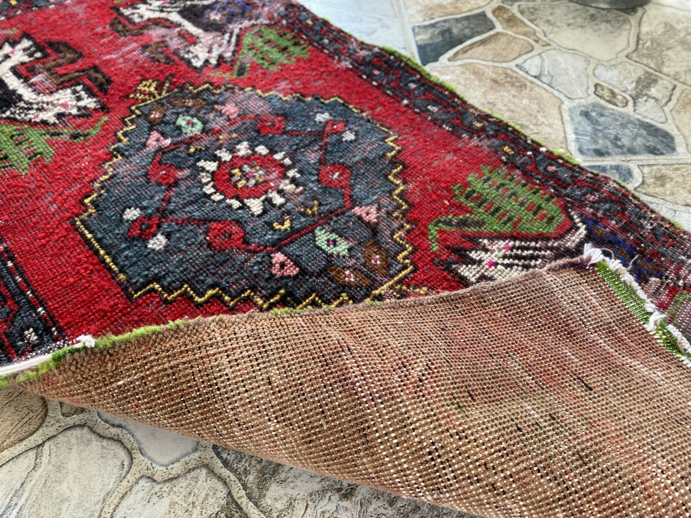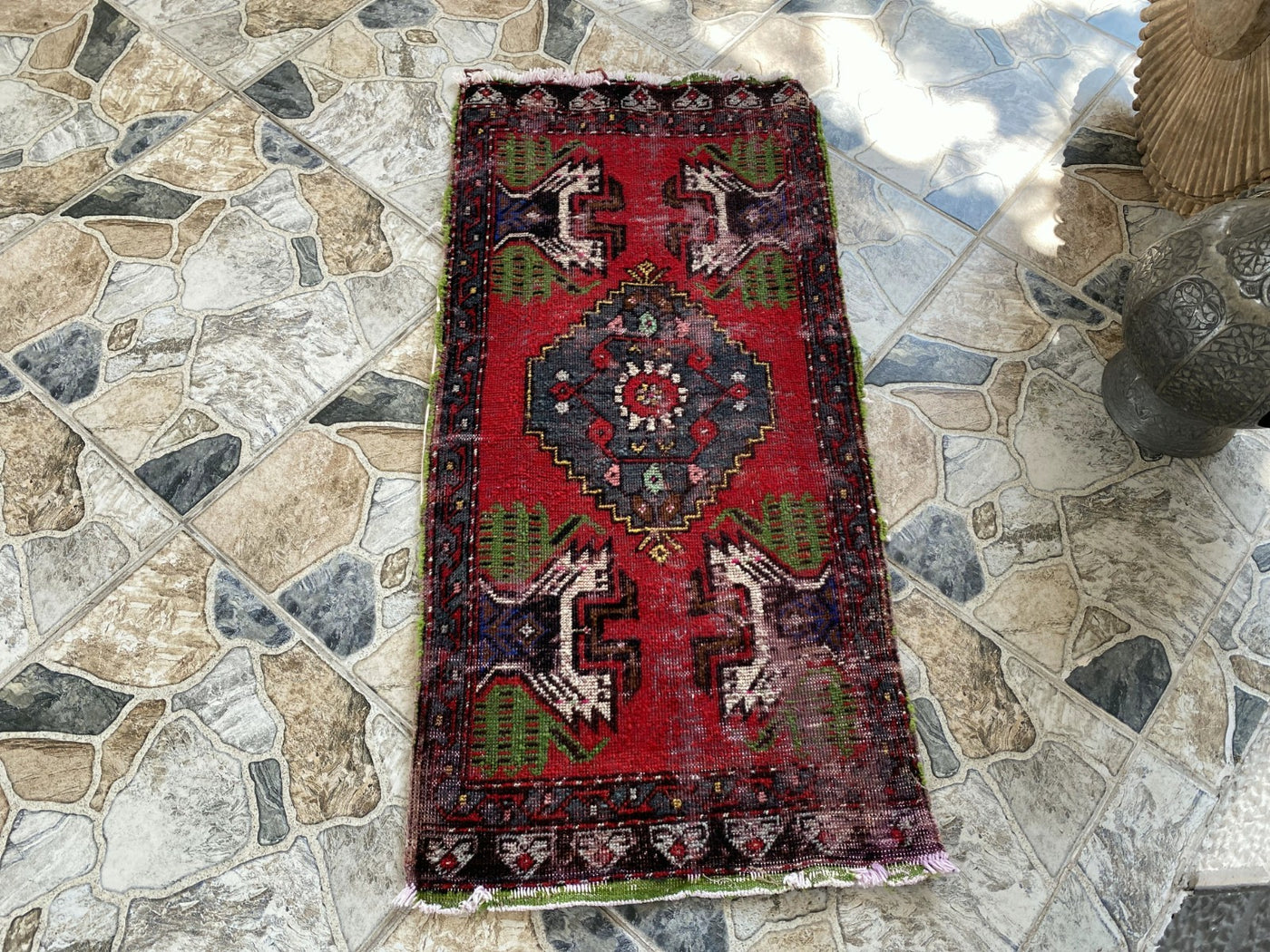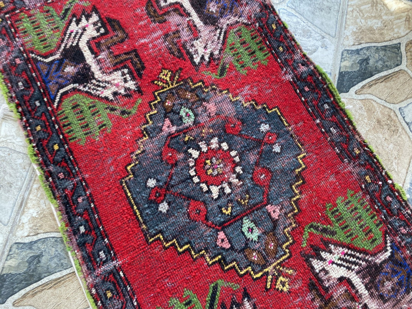 🔑 Tags / Keywords: Vintage rug, Small runner, Hand-knotted wool, Anatolian rug, Entryway rug, Kitchen rug, Geometric, Tribal, Red rug, Accent rug.