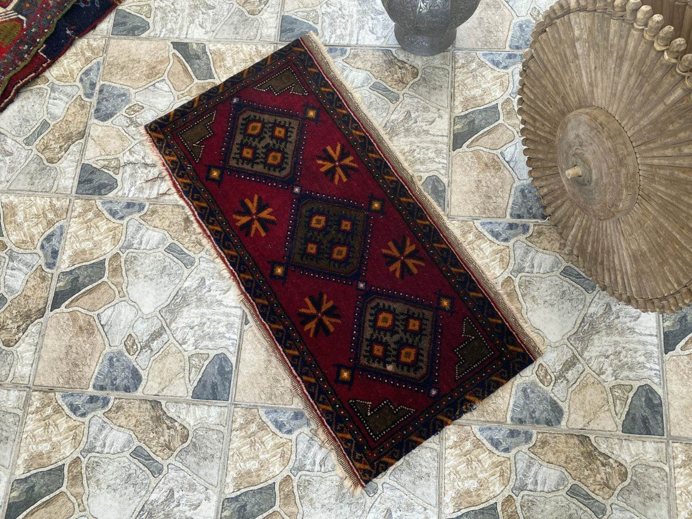 Straight from the soulful lands of Anatolia, this hand-knotted vintage rug brings a rhythmic harmony of geometric pattern and meaningful symbolism. Three striking diamond medallions run across a deep crimson field, flanked by radiant 8-pointed star motifs that echo ancient beliefs of guidance, light, and cosmic balance. Though petite in size, its bold pattern and rich palette instantly command attention.