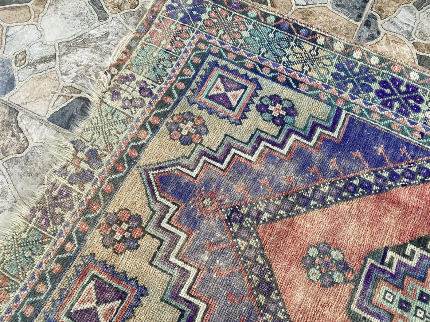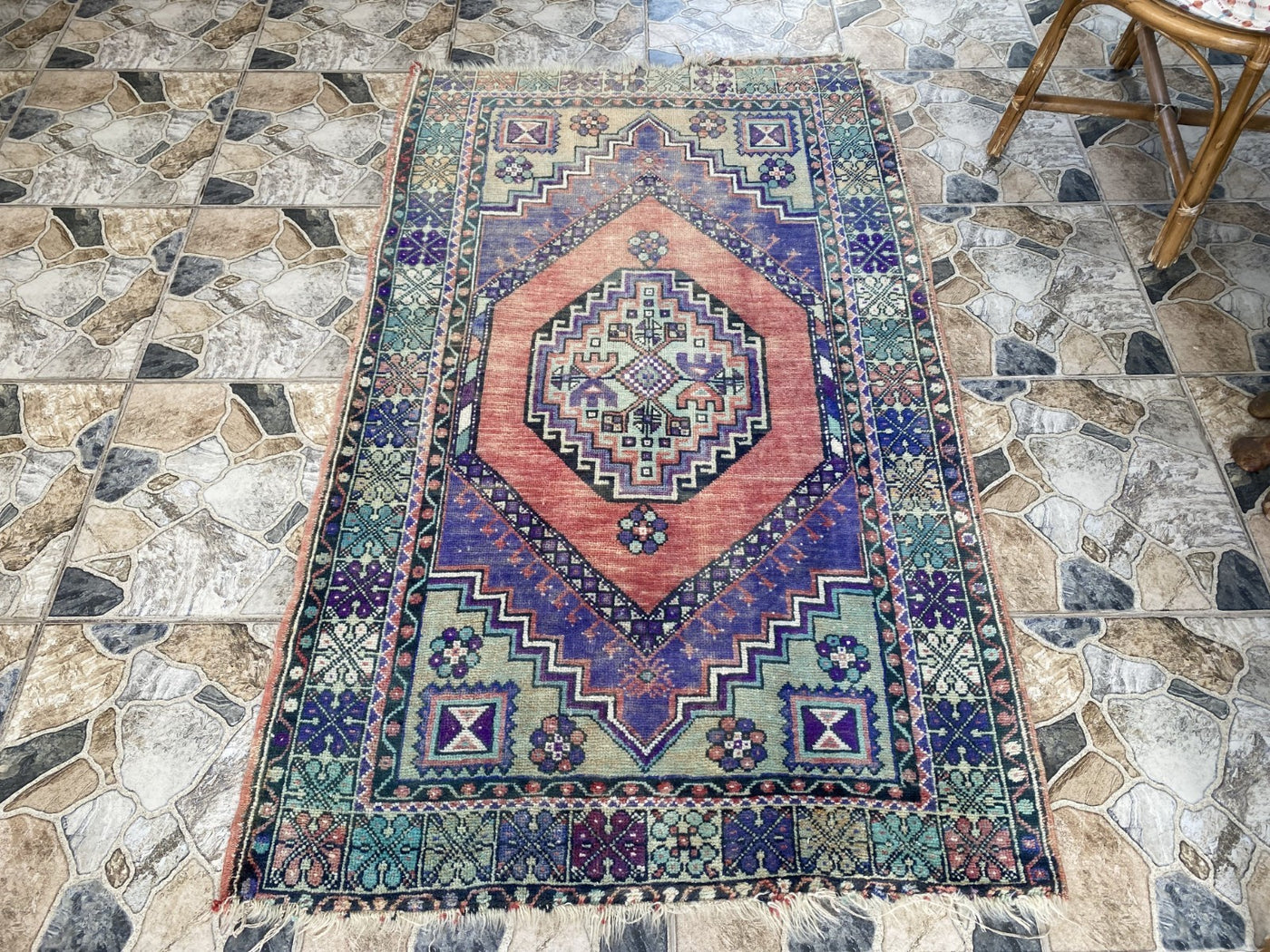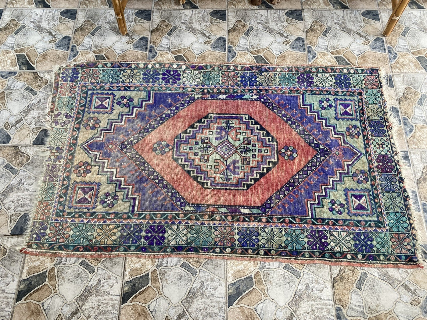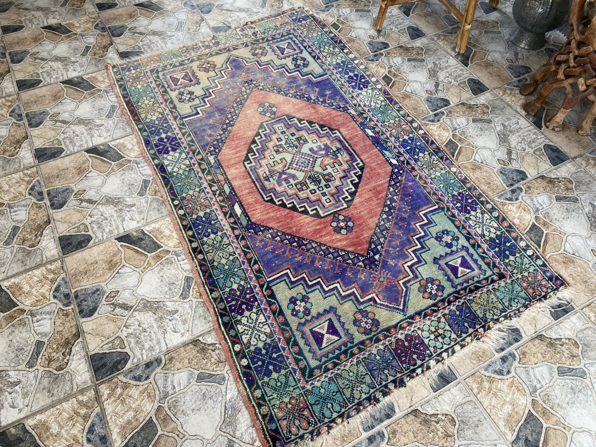 Keywords: Vintage rug, Handmade rug, Turkish rug, Wool rug, Ortakoy, Anatolian, Medallion rug, Red rug, Blue rug, 3x6 ft rug, Oriental.