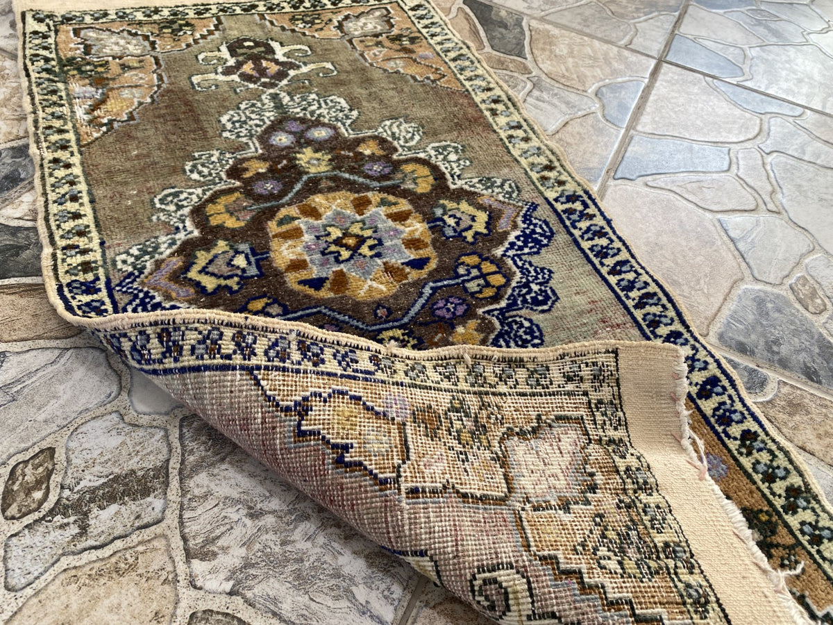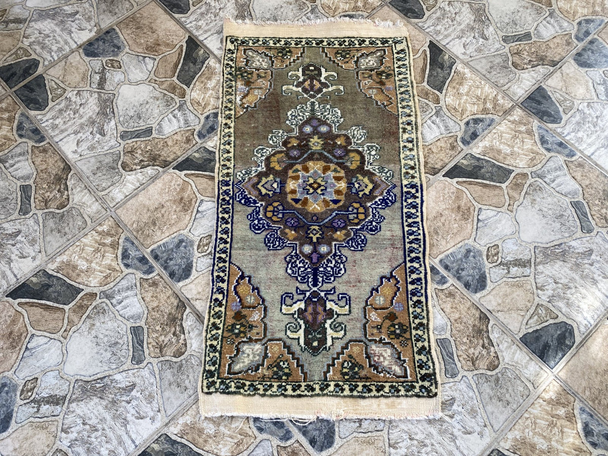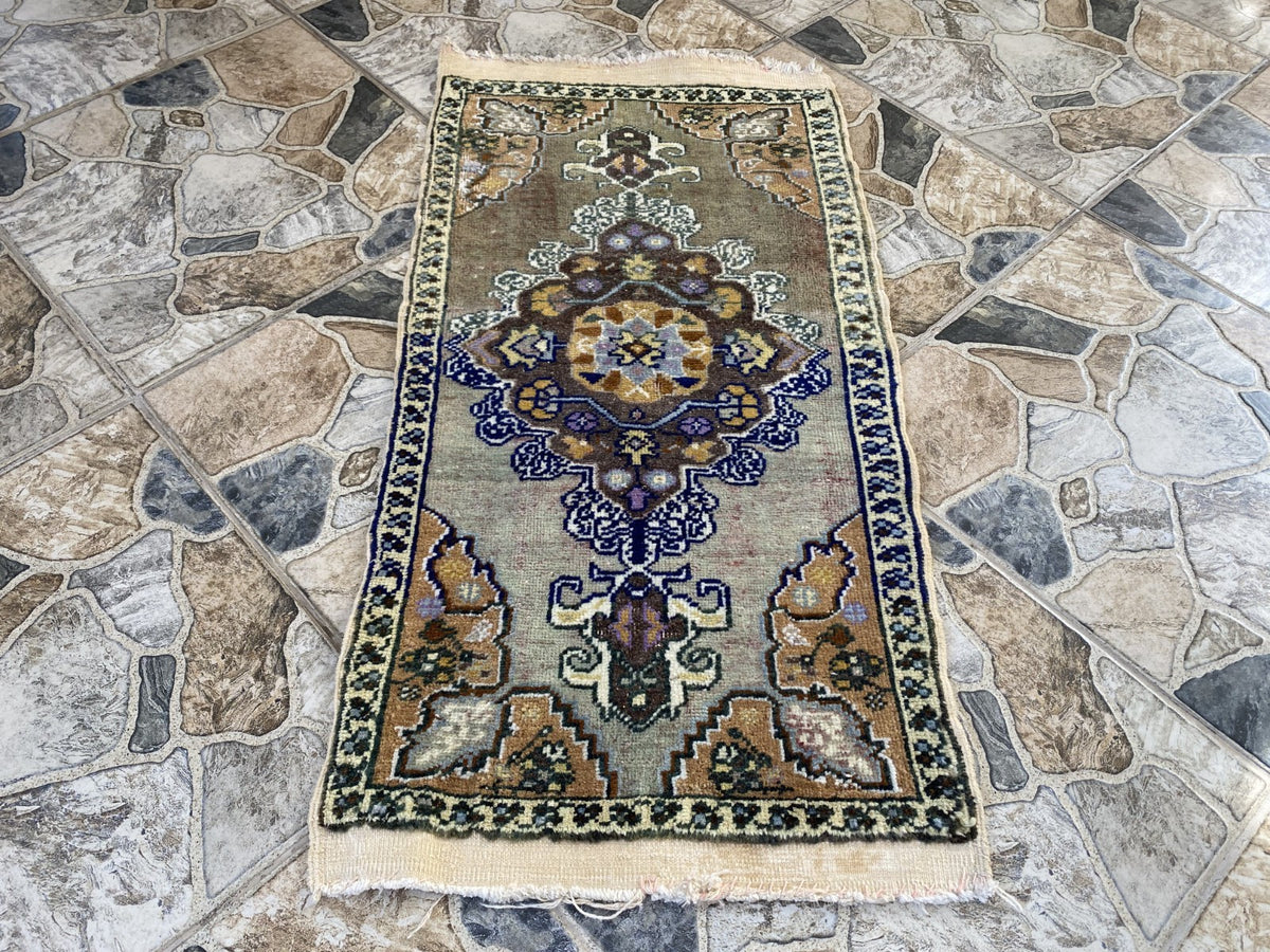 Small vintage rug, Hand-knotted wool, Anatolian rug, Distressed rug, Faded colors, Geometric medallion, Shabby-chic decor, Bohemian rug, Accent rug, Unique vintage.