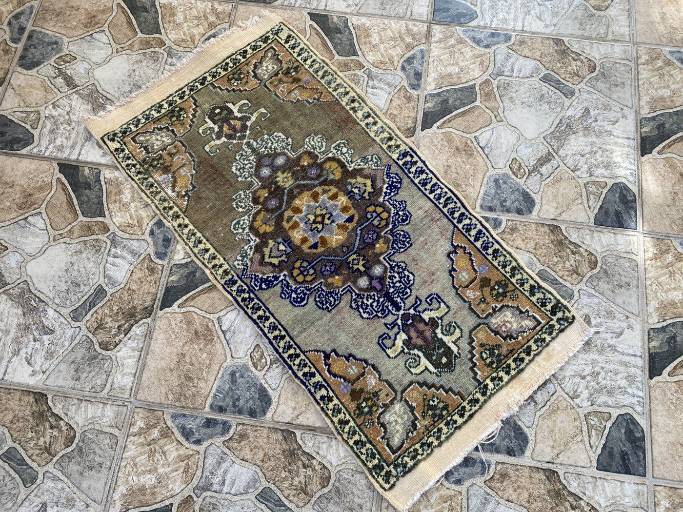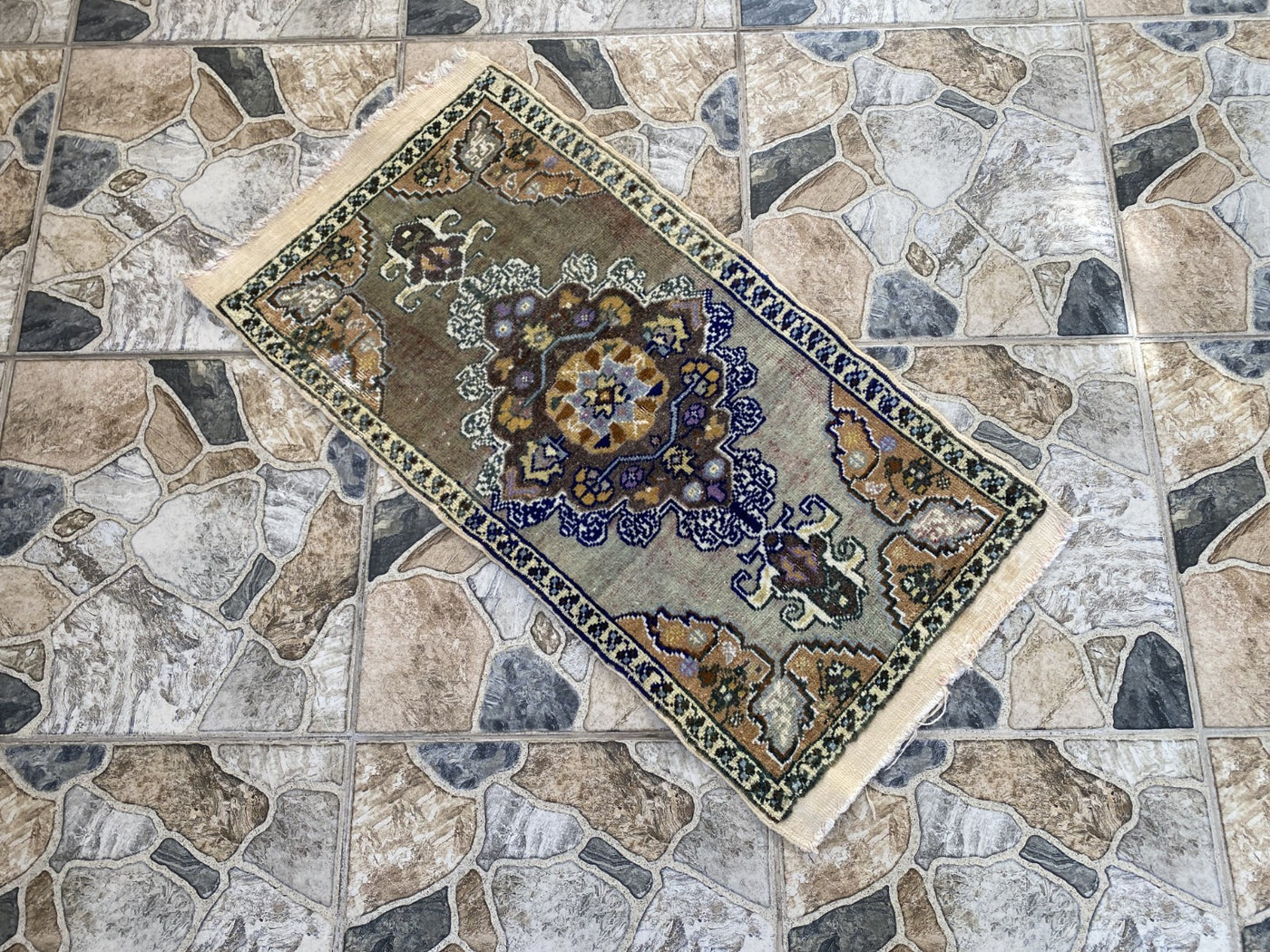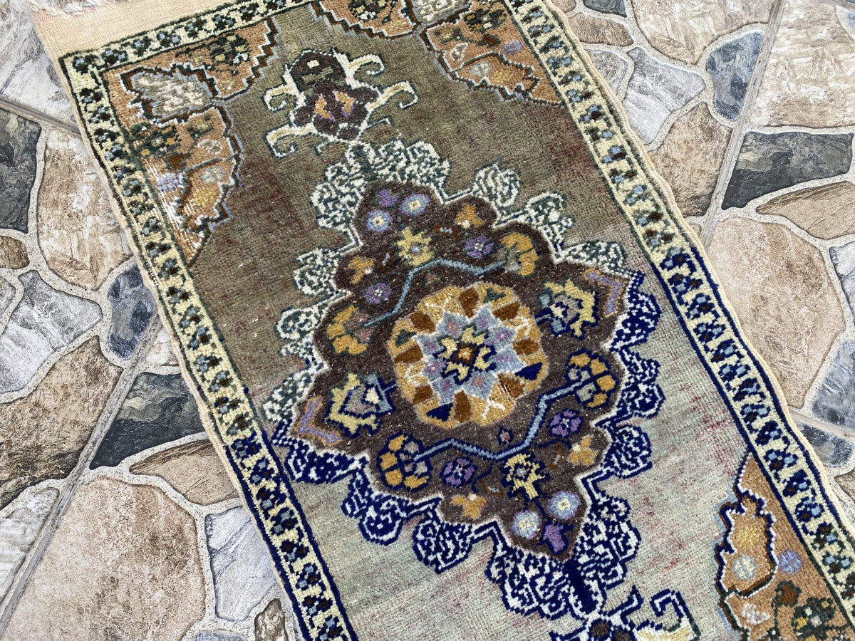 Small vintage rug, Hand-knotted wool, Anatolian rug, Distressed rug, Faded colors, Geometric medallion, Shabby-chic decor, Bohemian rug, Accent rug, Unique vintage.