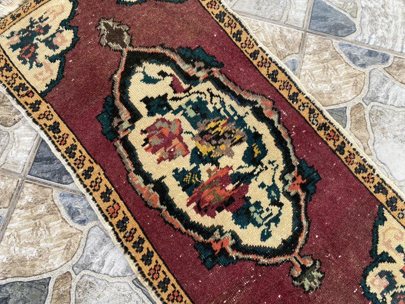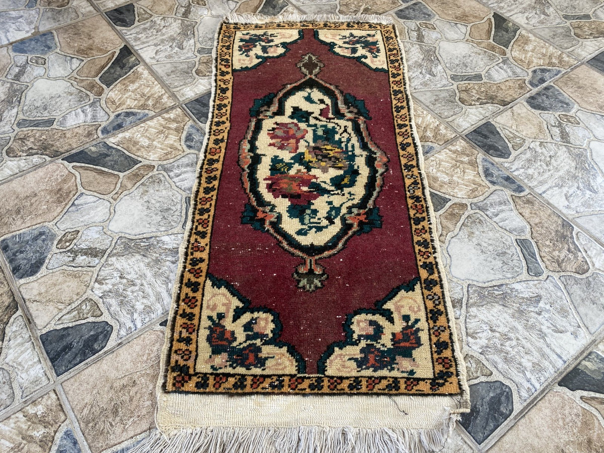 Small vintage rug, Hand-knotted wool, Anatolian rug, Distressed rug, Faded colors, Geometric medallion, Shabby-chic decor, Bohemian rug, Accent rug, Unique vintage.
