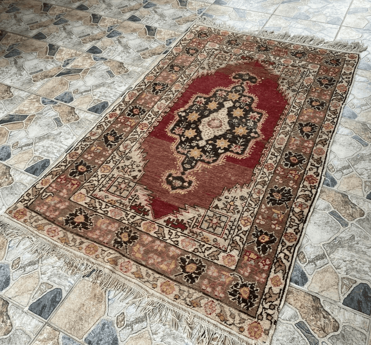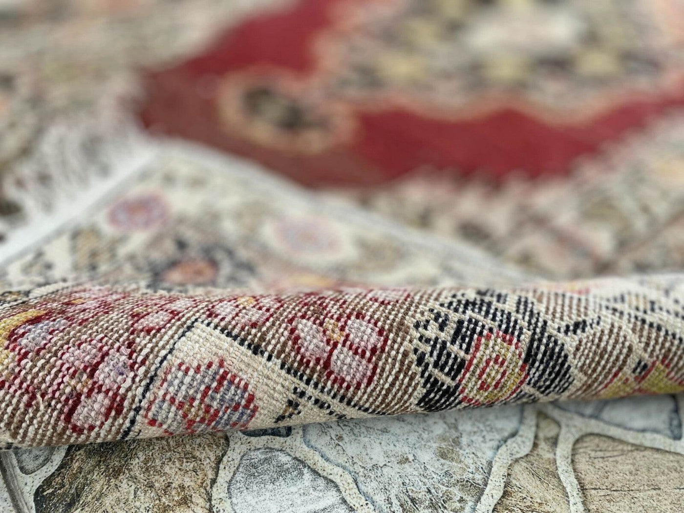 The rug's palette combines deep crimson reds, earthy browns, and delicate ivory accents, giving it a rich and vibrant appeal. These colors are rooted in Armenian and Persian weaving traditions, using natural dyes derived from plants and minerals.