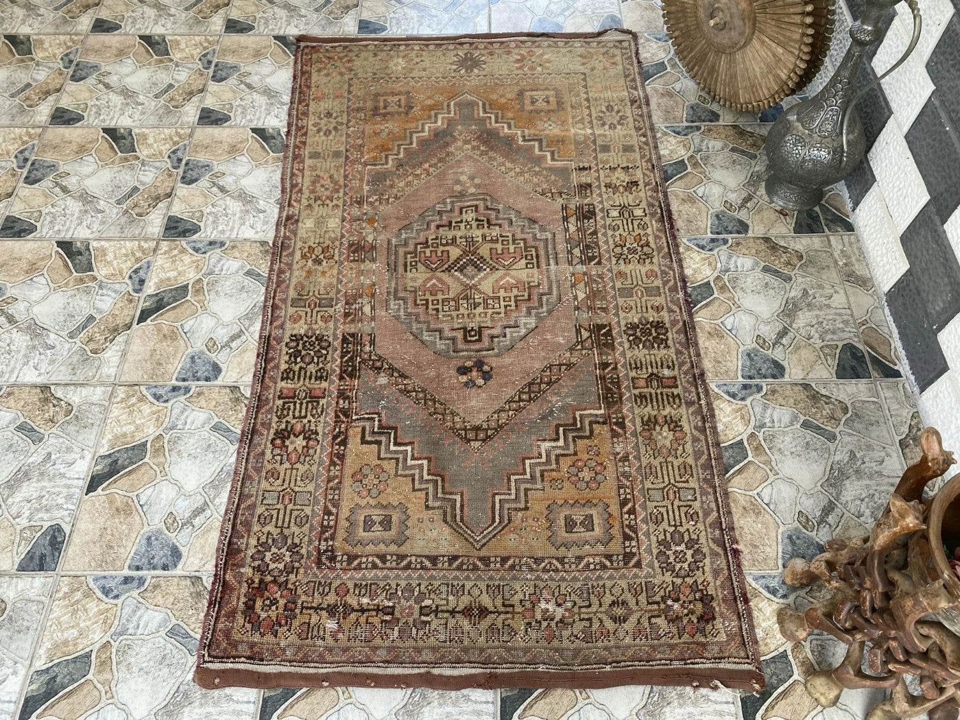 🔑 Tags / Keywords: Vintage Turkish rug, Hand-knotted wool rug, Distressed area rug, Tribal geometric rug, Bohemian decor, Farmhouse rug, Rustic home decor, Medium rug, Large rug, Anatolian carpet, Antique style rug, Living room rug, Bedroom rug, Dining room rug, Handwoven textile, Unique vintage find, Red rug, Blue rug, Terracotta rug, Village rug.