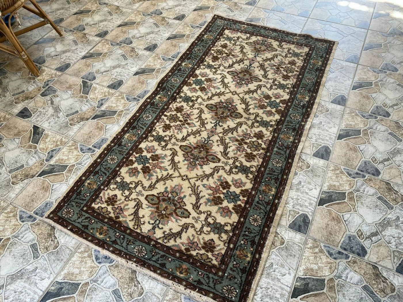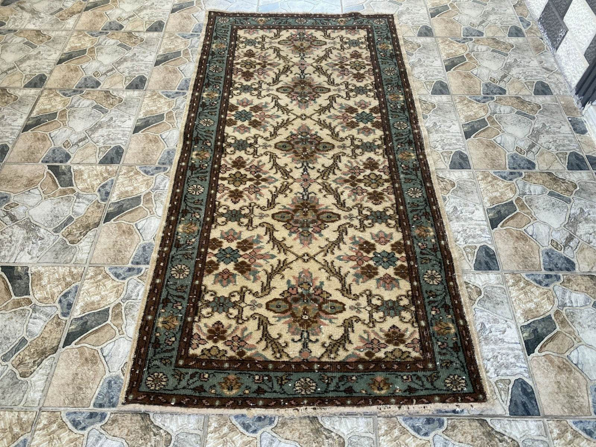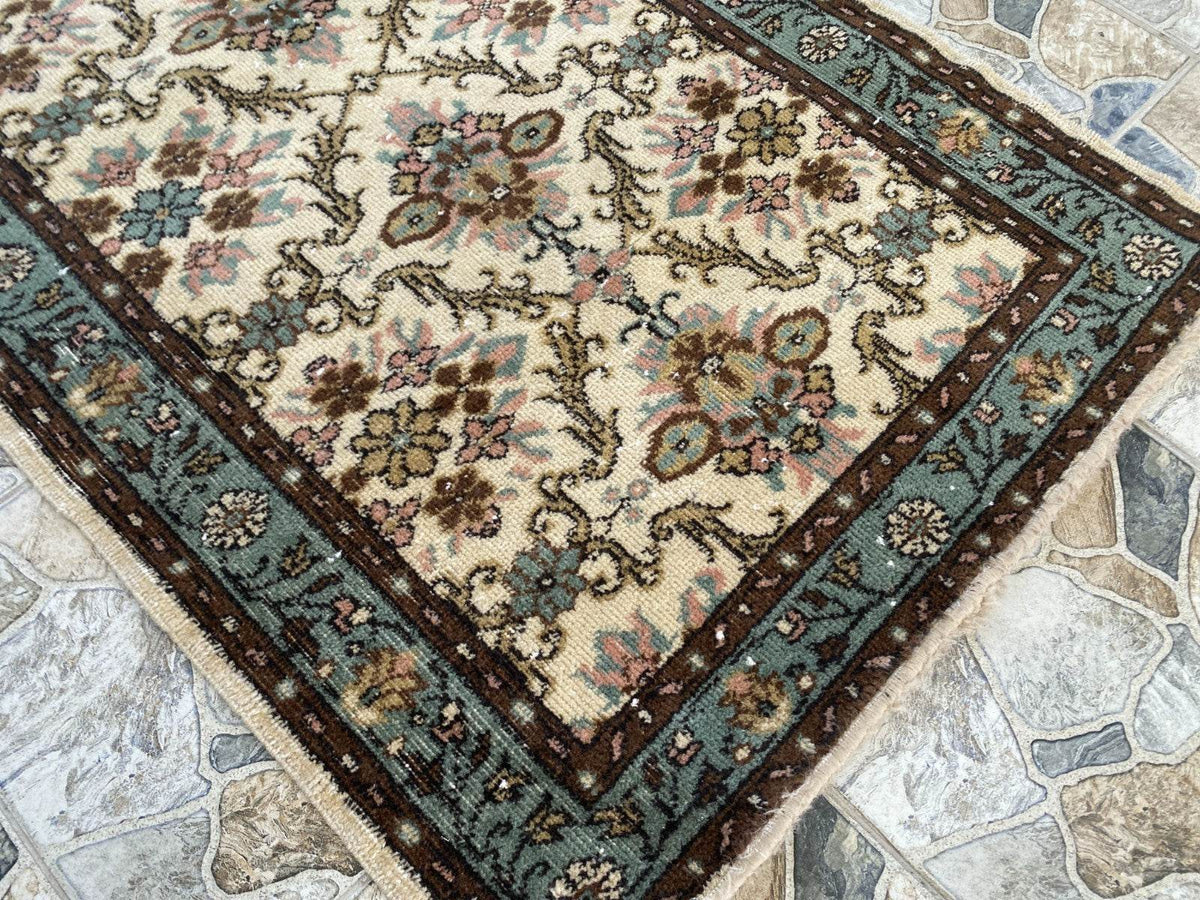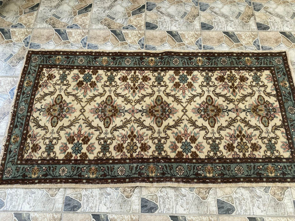 🔑 Tags / Keywords: Small vintage rug, Hand-knotted wool, Anatolian rug, Distressed rug, Faded colors, Geometric design, Rustic decor, Bohemian style, Area rug, Unique vintage.