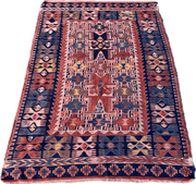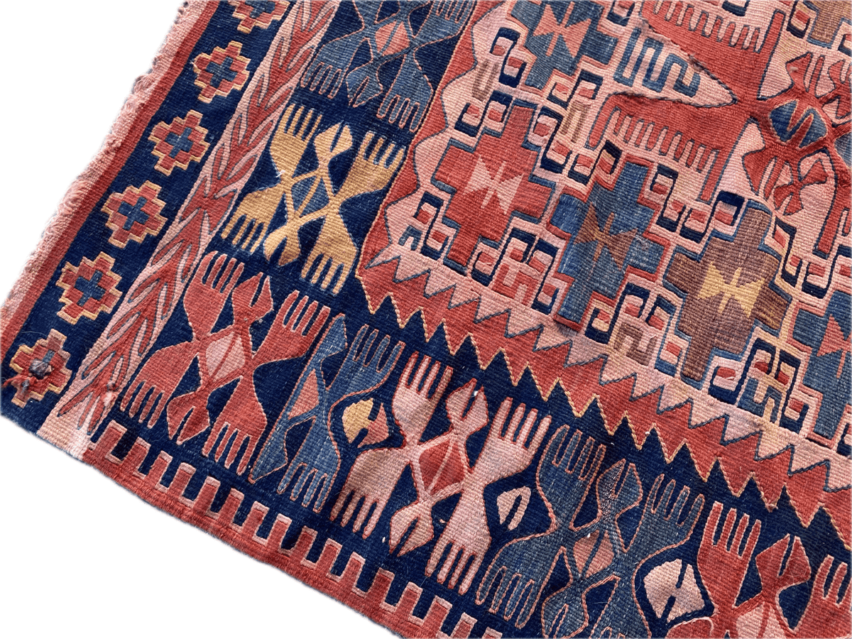 This rug has been preserved carefully but shows minor wear consistent with age and use. Small areas have undergone professional repairs to maintain its durability and aesthetic value, enhancing its authenticity as a true vintage piece.