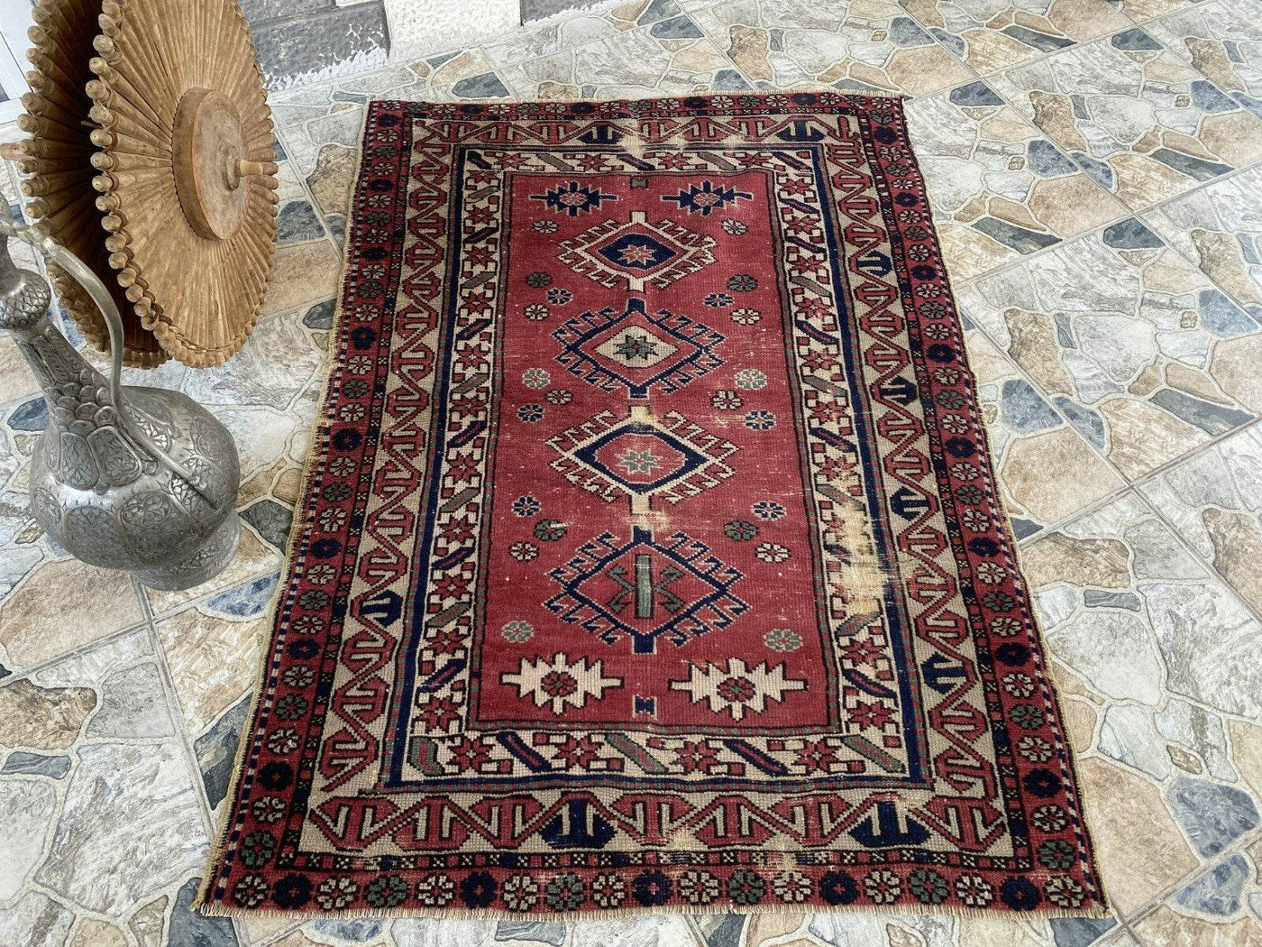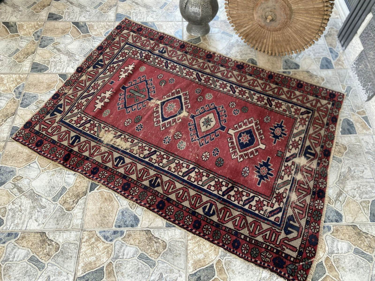 Vintage Caucasian Rug | 3.5x5 ft | Tribal Handmade Wool Rustic Farmhouse Carpet