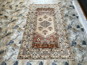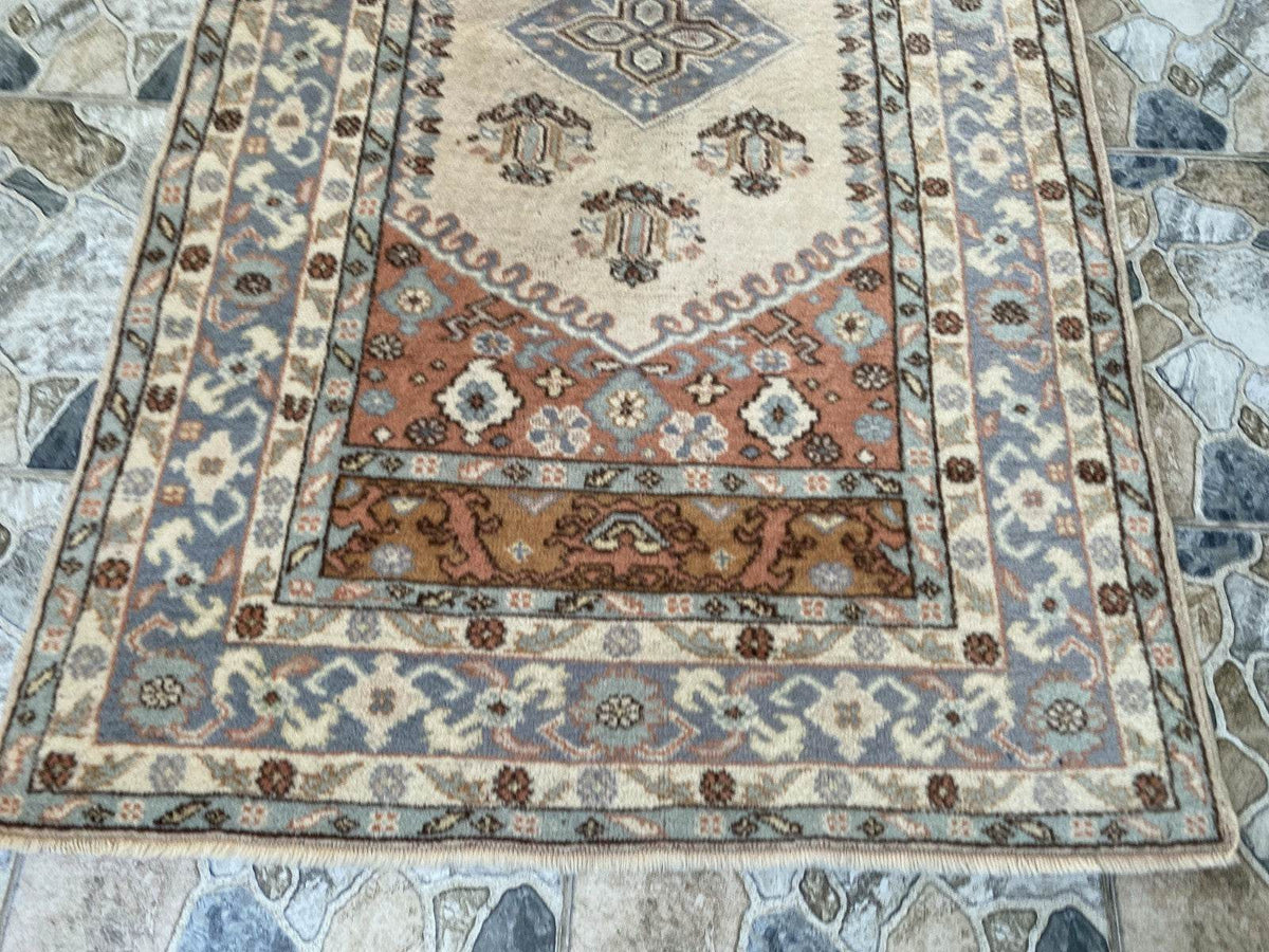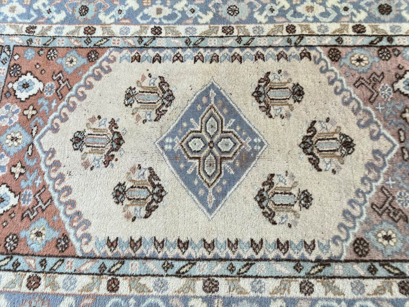 🎨 Design & Color Palette: Central Medallion & Faded Tones The design is a classic Kula pattern, featuring a central field with a medallion and intricate geometric motifs. The border is detailed and complements the main design. The color palette is defined by soft, faded tones, including a dominant beige/cream field with light red, subtle blue, and dusty pink accents. The distressed appearance and natural wear give this piece a unique, timeless character that is highly sought after.