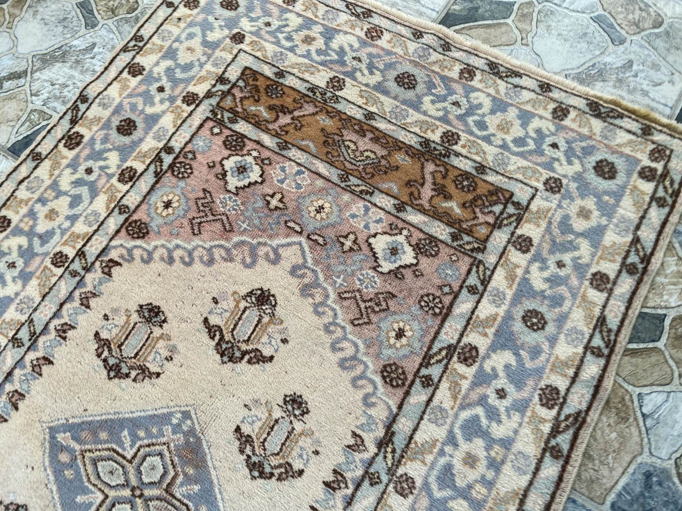 🔑 Tags / Keywords: Vintage Kula rug, Hand-knotted wool, Anatolian rug, Distressed rug, Faded colors, Medallion design, Bohemian style, Area rug, Unique vintage.