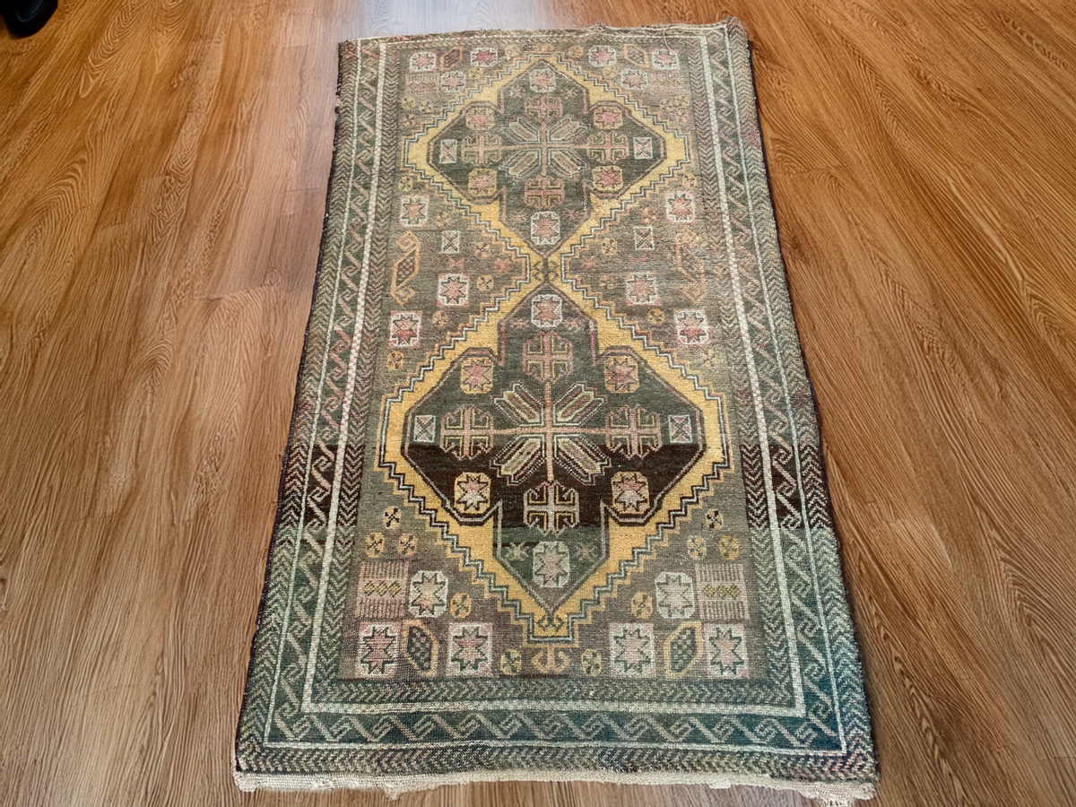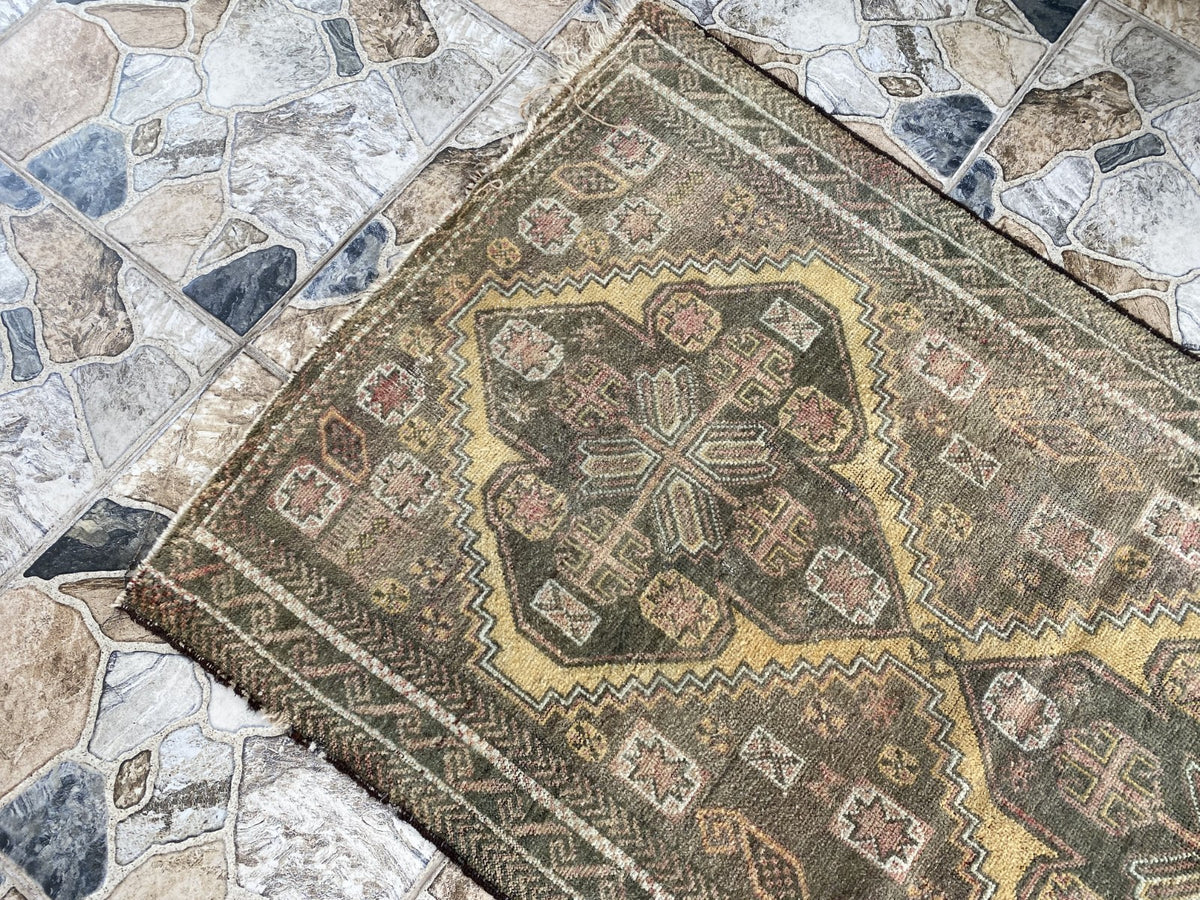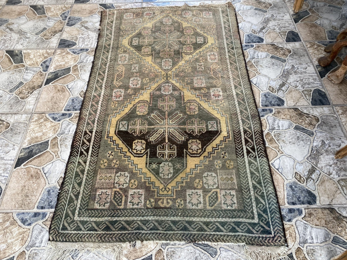 Elevate your living space with this authentic vintage Persian Beluch rug, a true expression of tribal artistry and heritage. This hand-knotted wool carpet, compact in size yet rich in character, brings warmth, depth, and cultural storytelling into any home. Its intricate tribal motifs and naturally faded tones make it not just a rug, but a collectible piece of history.