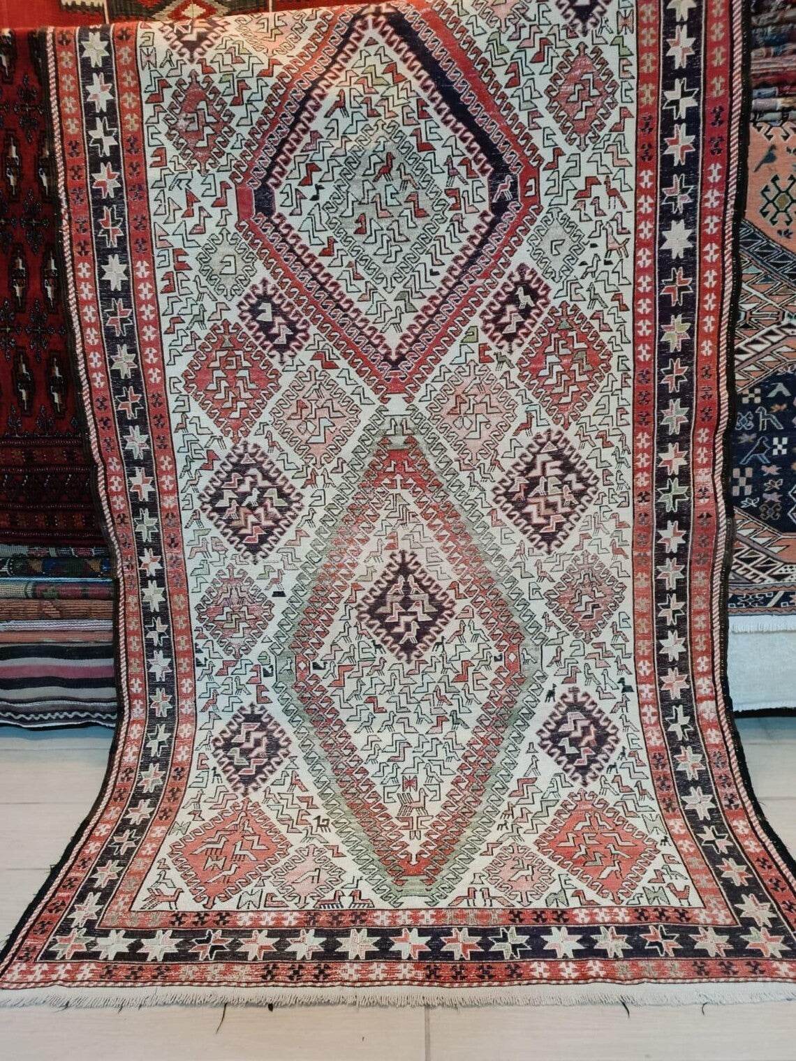 🎨 Design & Color Palette: Intricate Geometry & Rich Tones This stunning Persian Soumak rug features a prominent central geometric medallion intricately detailed with tribal motifs. The field is primarily a crisp ivory/off-white, providing a striking contrast to the medallion and borders. The main colors within the design are vibrant reds, deep blues/indigos, and accents of muted greens, black, and touches of pastel tones. The exceptional detail and the subtle luster from the silk threads make this a truly captivating piece.