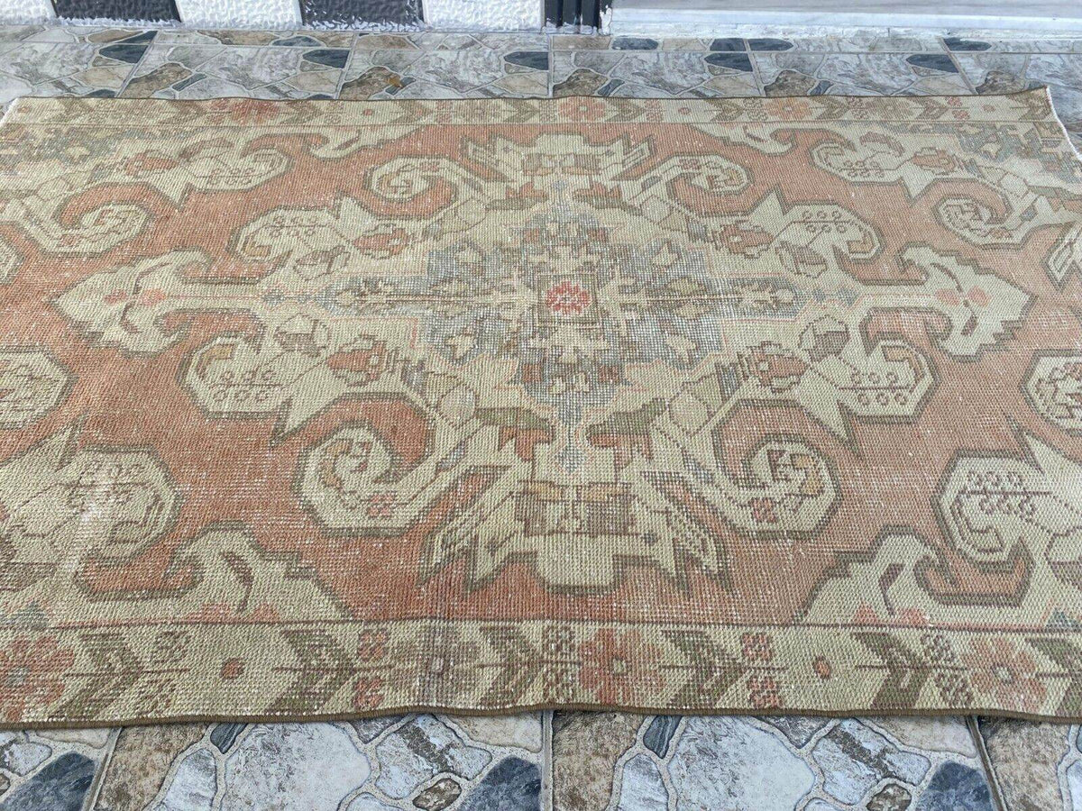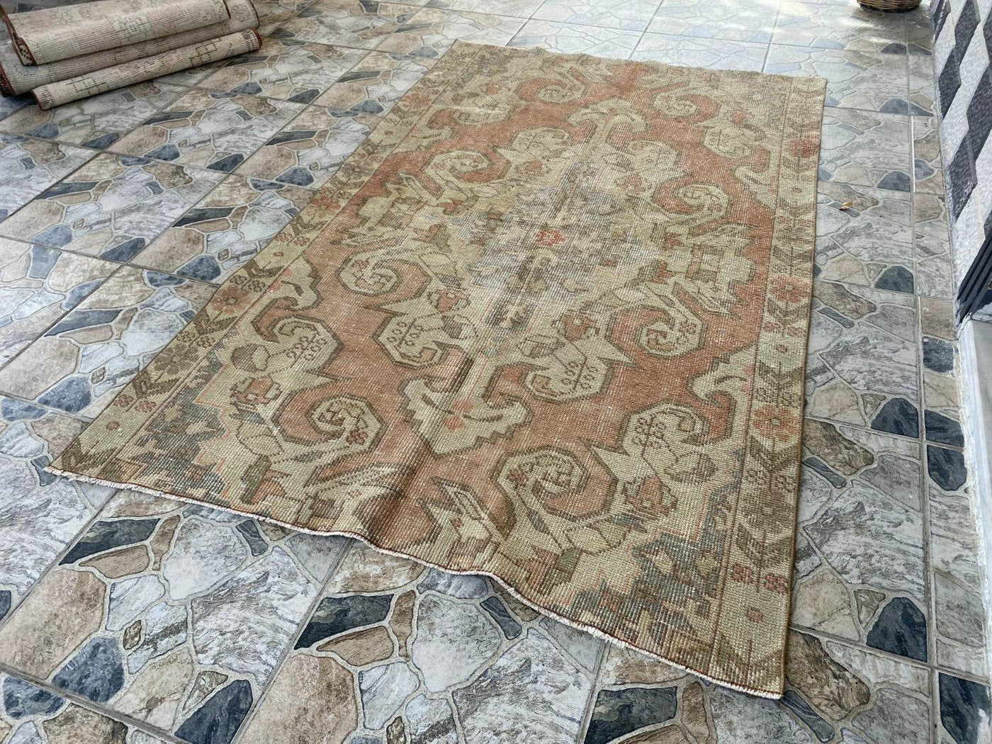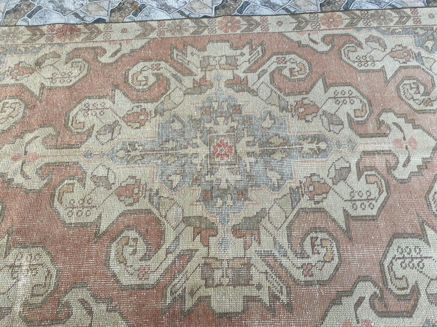 This stunning vintage Anatolian rug features a beautifully aged terracotta-red base, harmonized with soft beige, muted olive, and deep brown motifs. The symmetrical medallion and intricate borders create a striking contrast, adding depth and elegance.