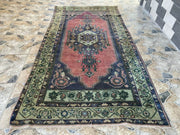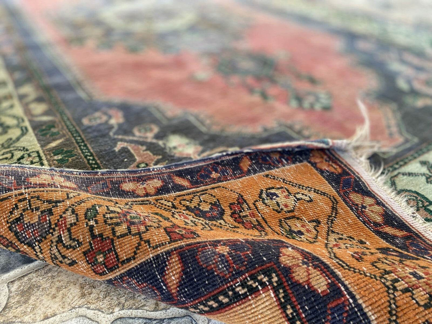 The border consists of repeating botanical motifs that frame the rug beautifully, creating a cohesive and ornate appearance. These patterns enhance the traditional feel of the rug, tying it to its mid-century origins.