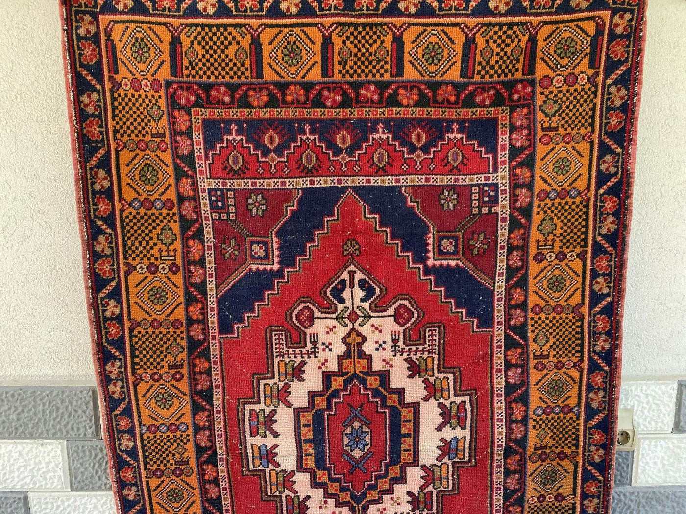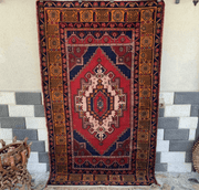 This authentic vintage Turkish rug showcases the timeless artistry of Anatolian craftsmanship. Hand-knotted with 100% wool pile on a durable cotton foundation, it features a radiant crimson red field, centered by a powerful medallion in ivory, navy, and ochre. The rich color palette, bold tribal motifs, and traditional border elements make this rug a compelling heirloom piece full of character and soul.