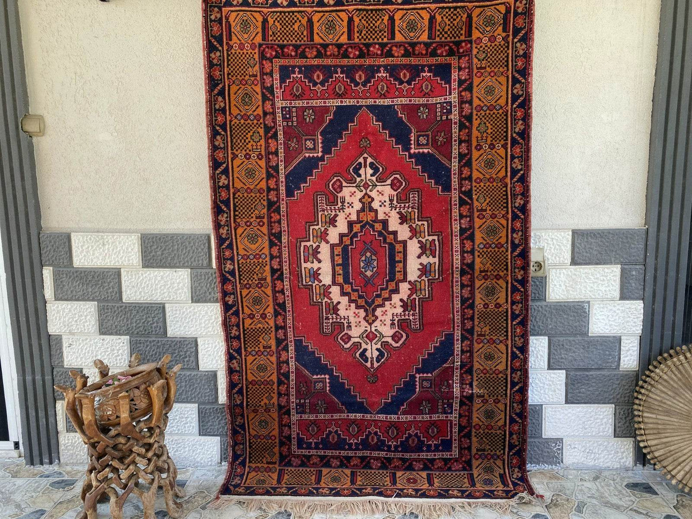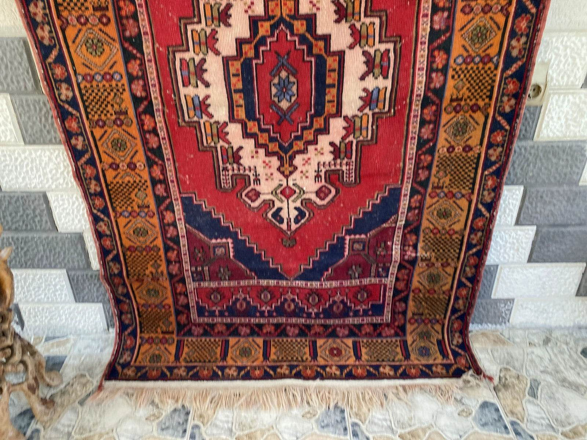The rug includes traditional Anatolian motifs such as the ram’s horn (strength), elibelinde (fertility/womanhood), and star-shaped rosettes (guidance and divine connection).