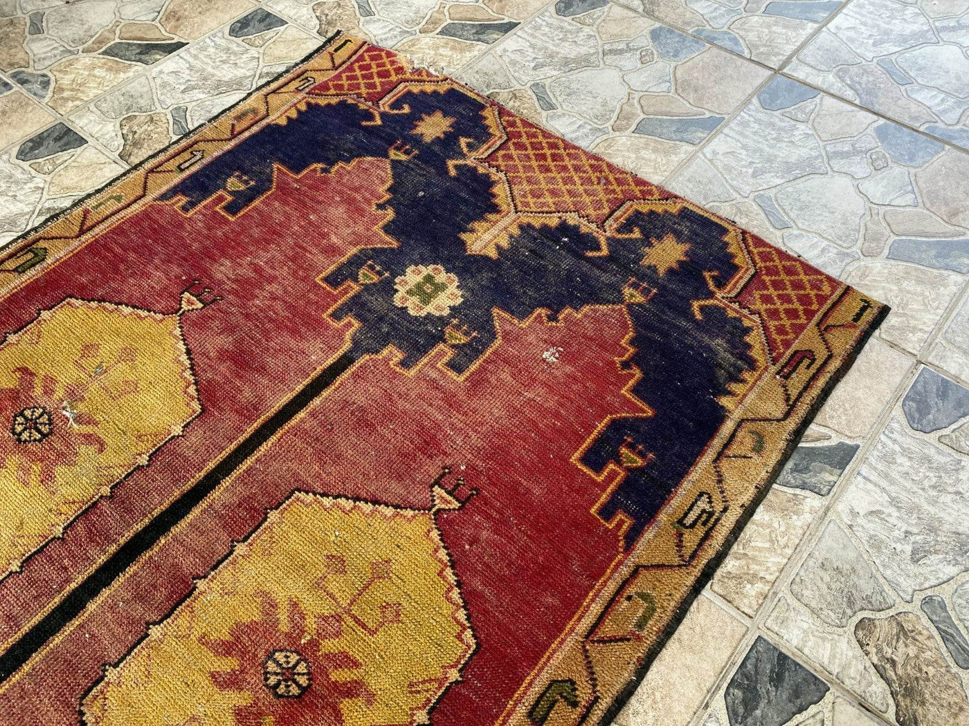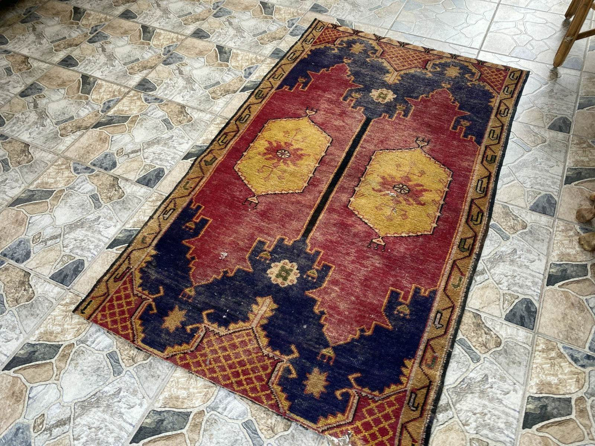 🔑 Tags / Keywords: Vintage Turkish rug, Hand-knotted wool, Anatolian rug, Geometric rug, Red and blue rug, Restored vintage, Tribal decor, Bohemian rug, Rustic decor, Small area rug, Unique vintage.