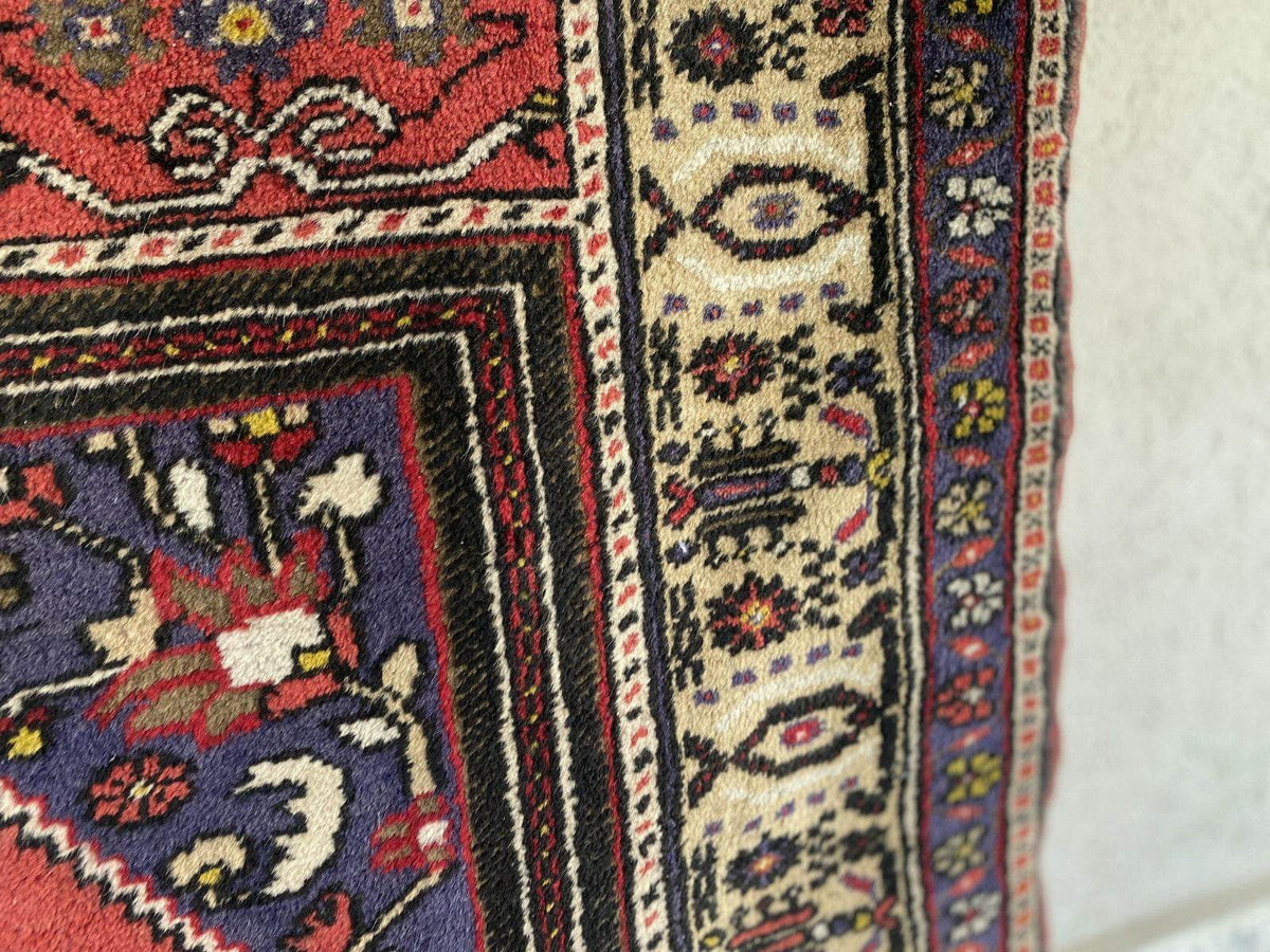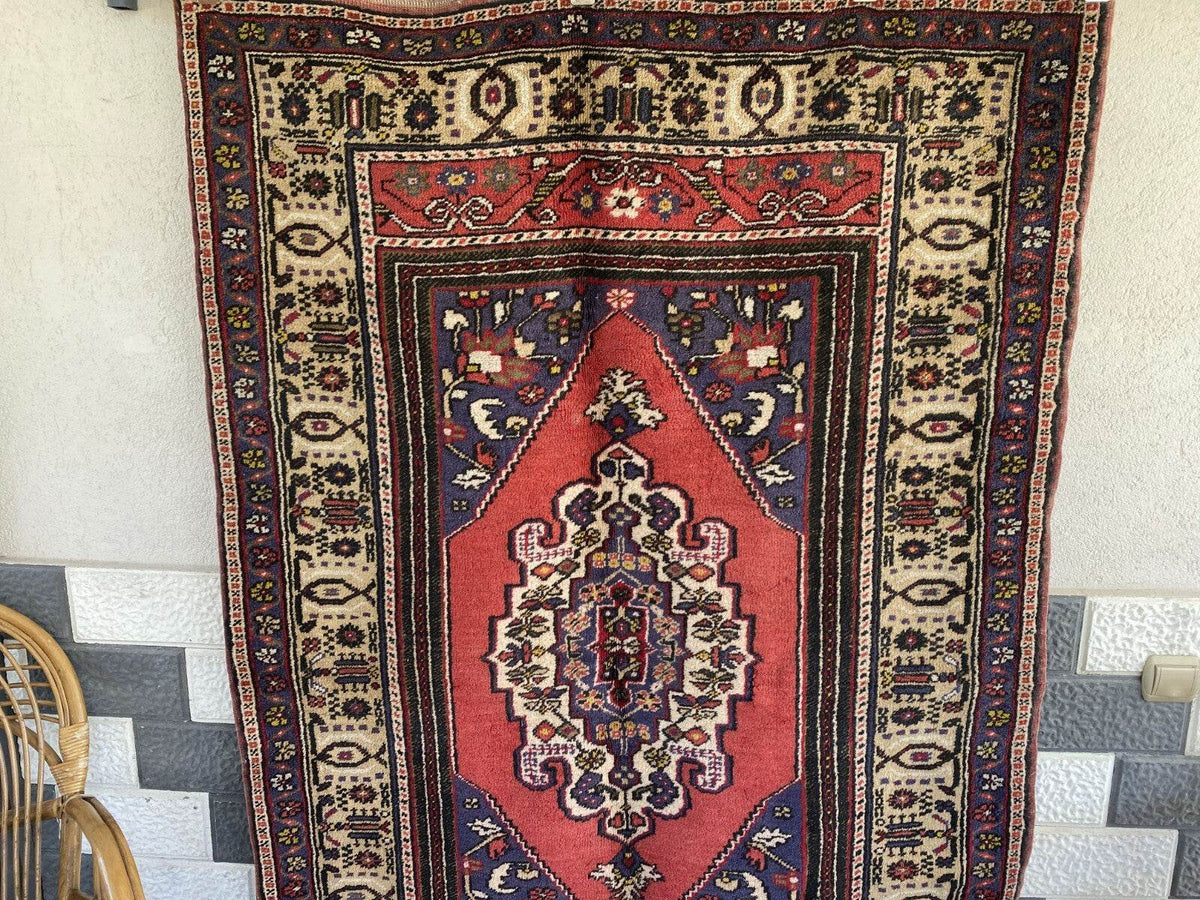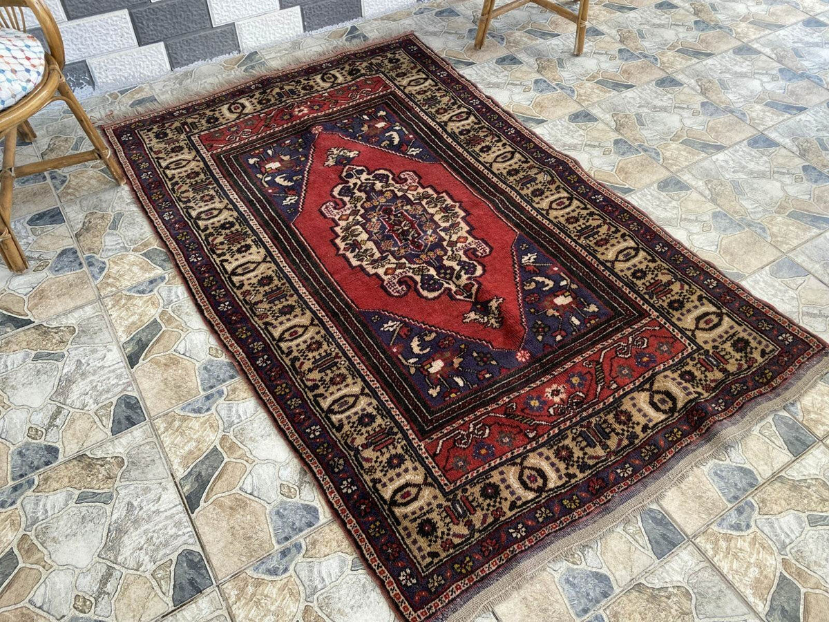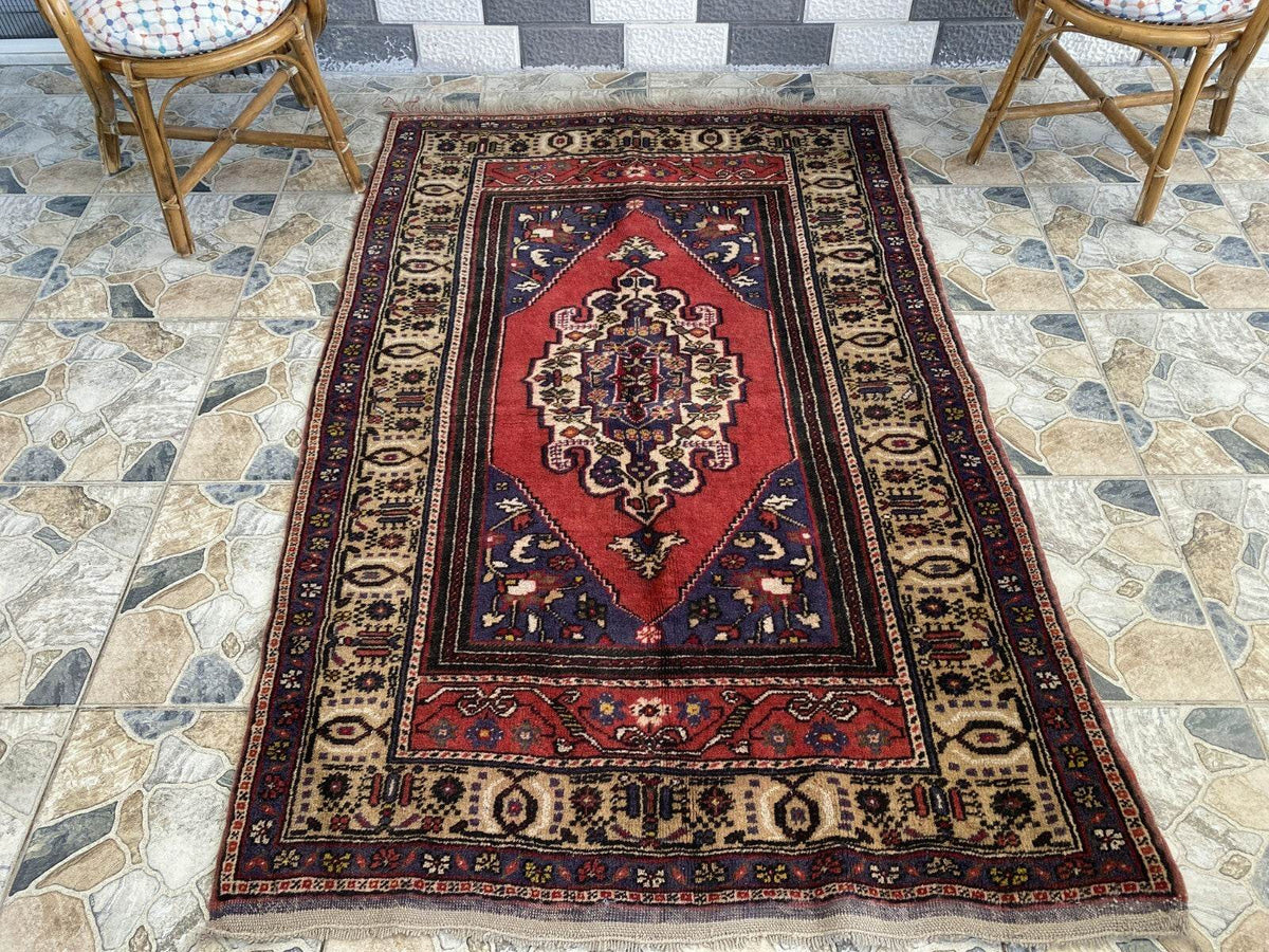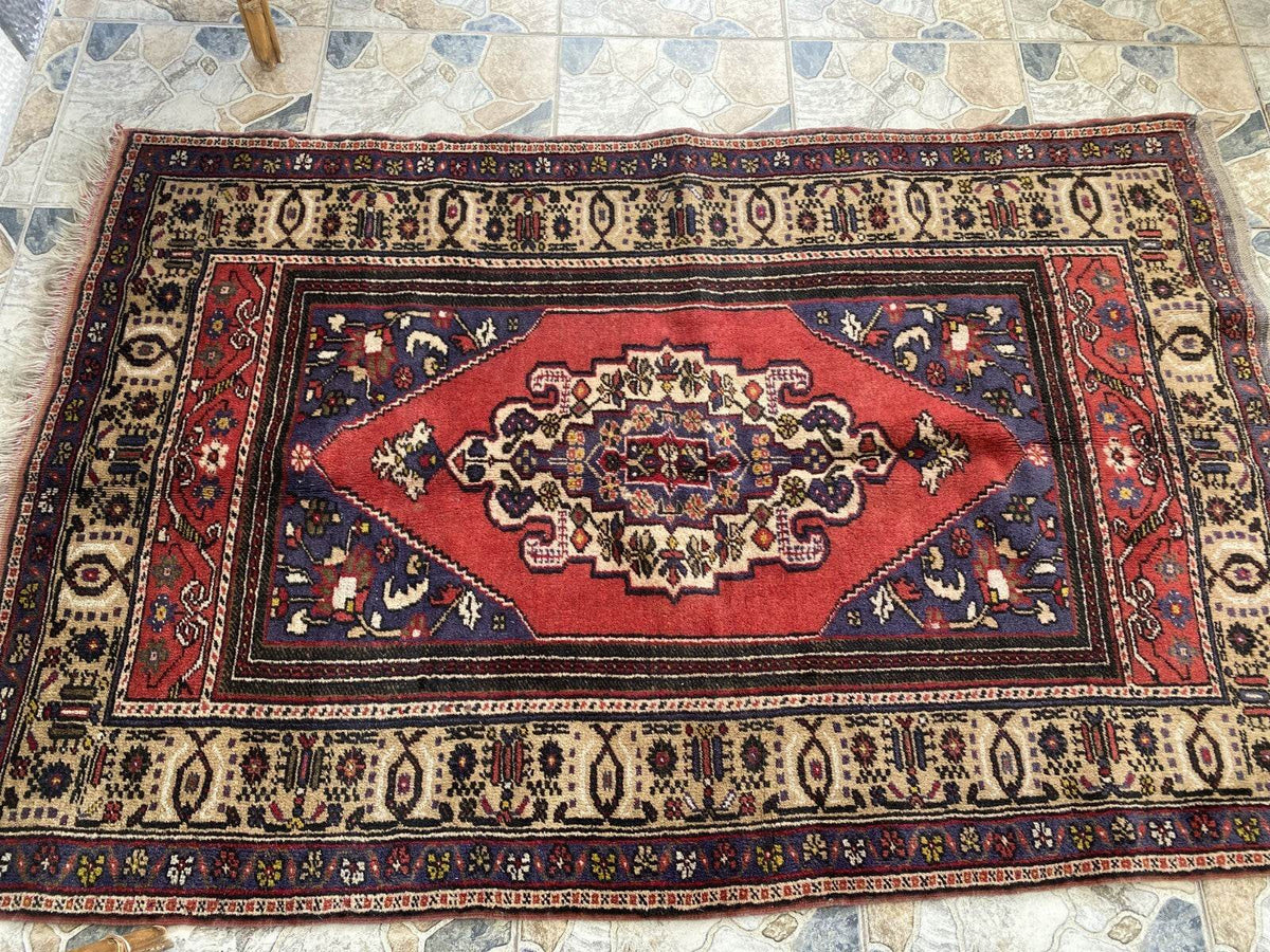 Vintage Turkish Rug | 132 x 198 cm | Handmade Wool Rug | Red & Navy Medallion Design 🧿 Classic...