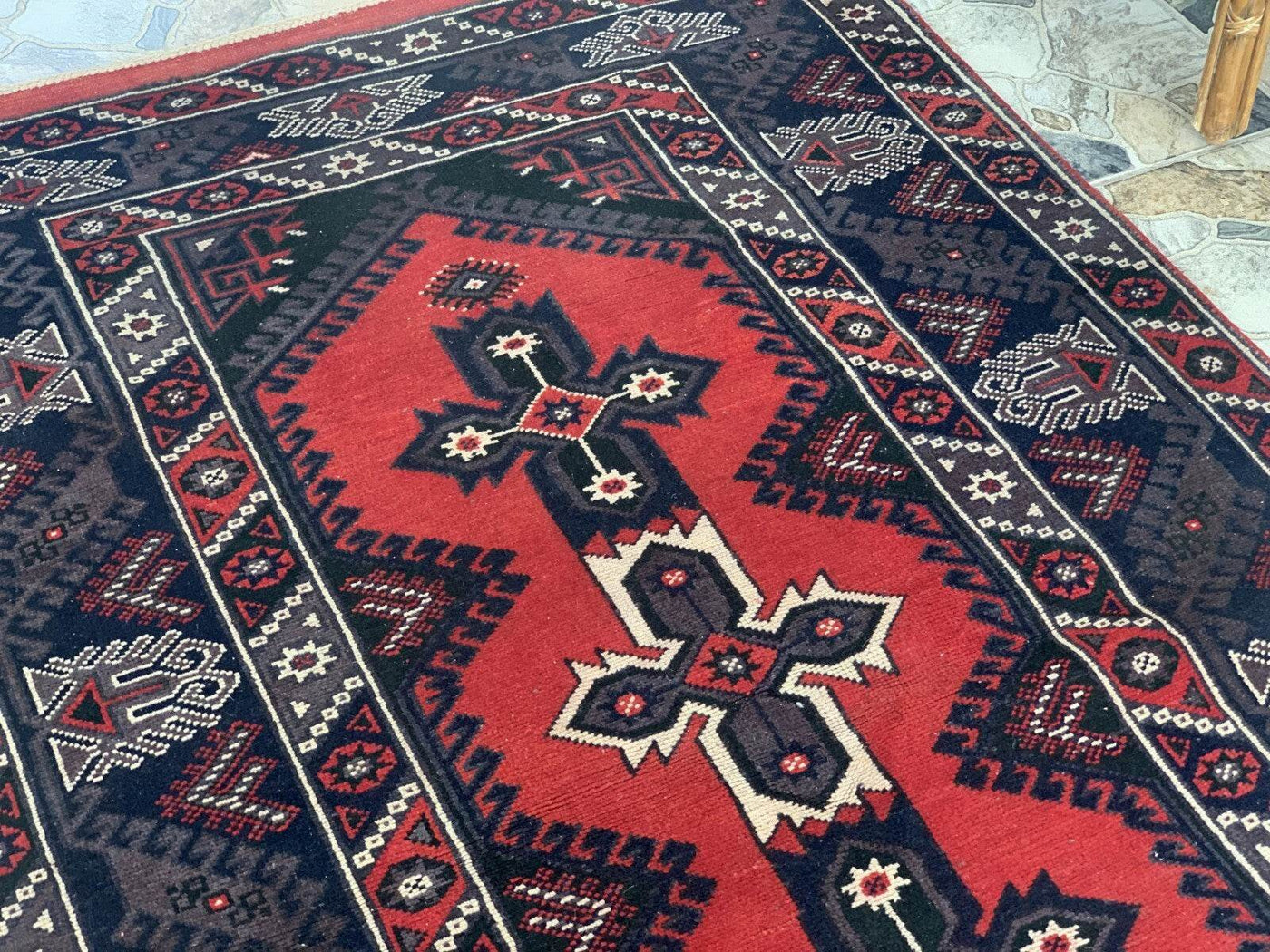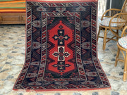 This rug boasts a captivating combination of deep reds and navy blues, highlighted by intricate geometric patterns and traditional tribal motifs. The central medallion design, flanked by stylized floral and symbolic elements, showcases the artistry and attention to detail typical of Turkish rugs. The border features a series of repeating motifs, creating a harmonious and balanced look that is both visually stunning and culturally significant.