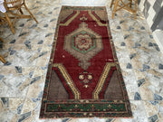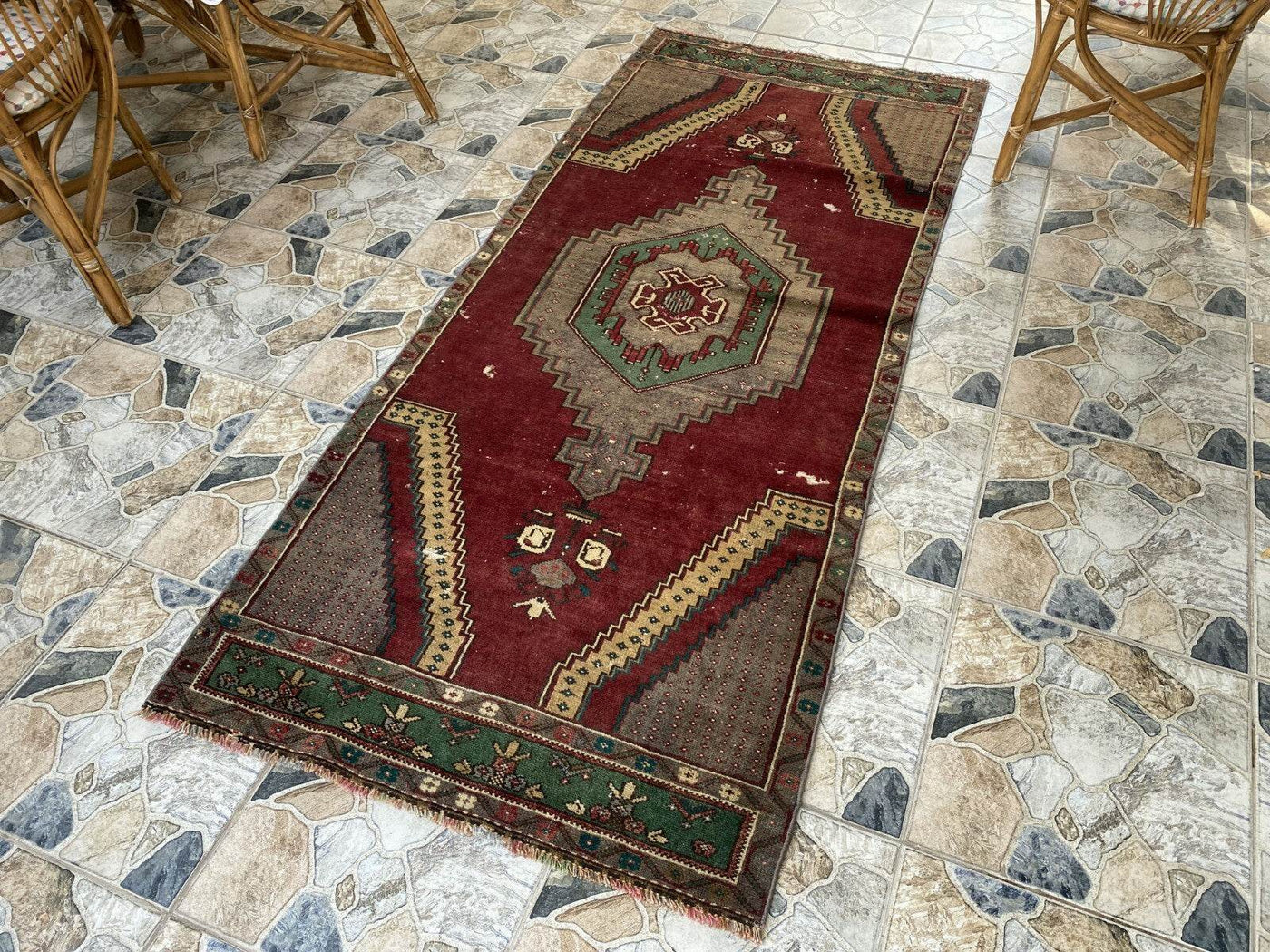 This vintage Turkish rug, with dimensions of 100 x 236 cm (3.2 x 7.7 ft) or 39 x 93 inches, is a true representation of traditional Anatolian craftsmanship, specifically from the region known for its rich history of rug weaving. The bold burgundy background, complemented by earthy greens and subtle gold accents, reflects the deep cultural heritage of the area.