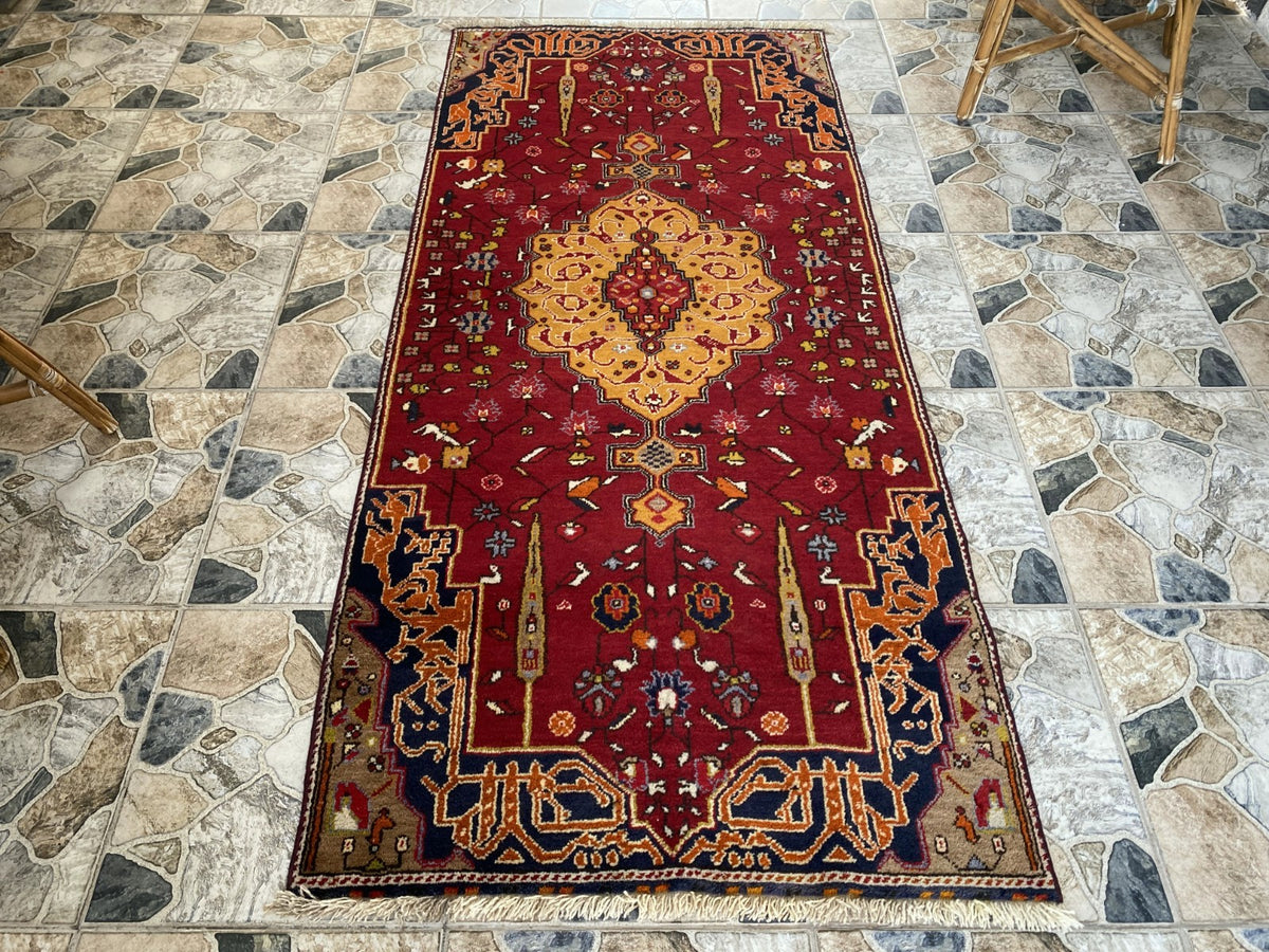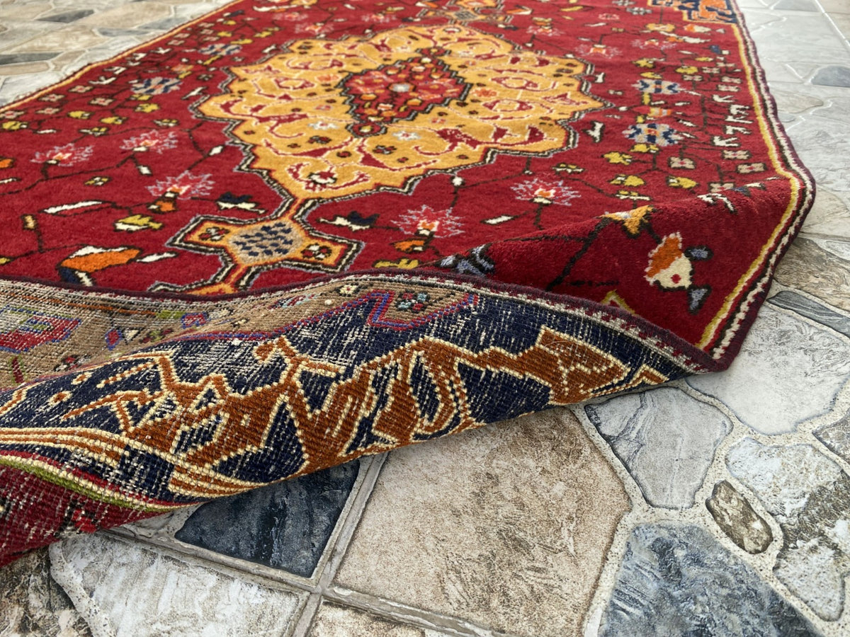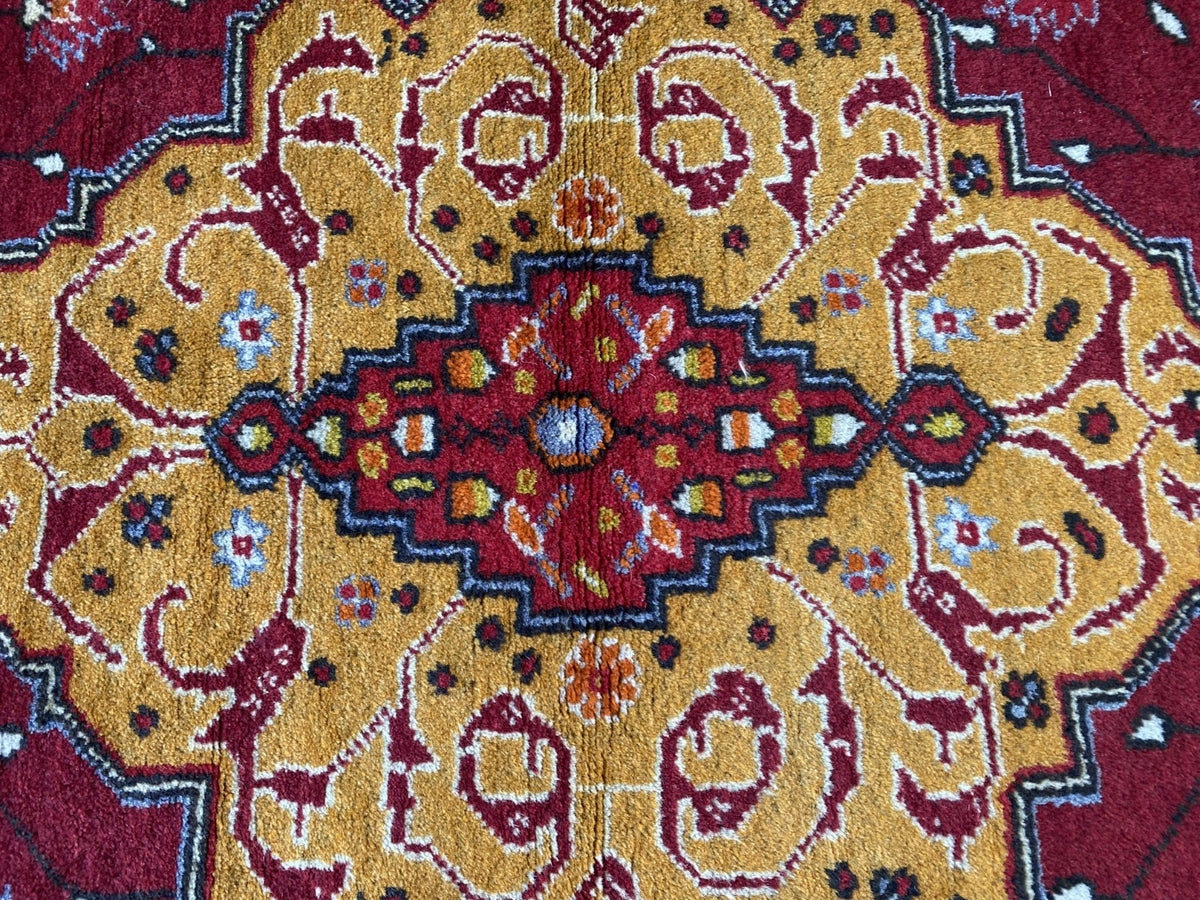 Condition: Excellent vintage condition. Please note that the rug has been professionally repaired in some areas to maintain its structural integrity and beauty. It has been professionally cleaned and is ready for use.