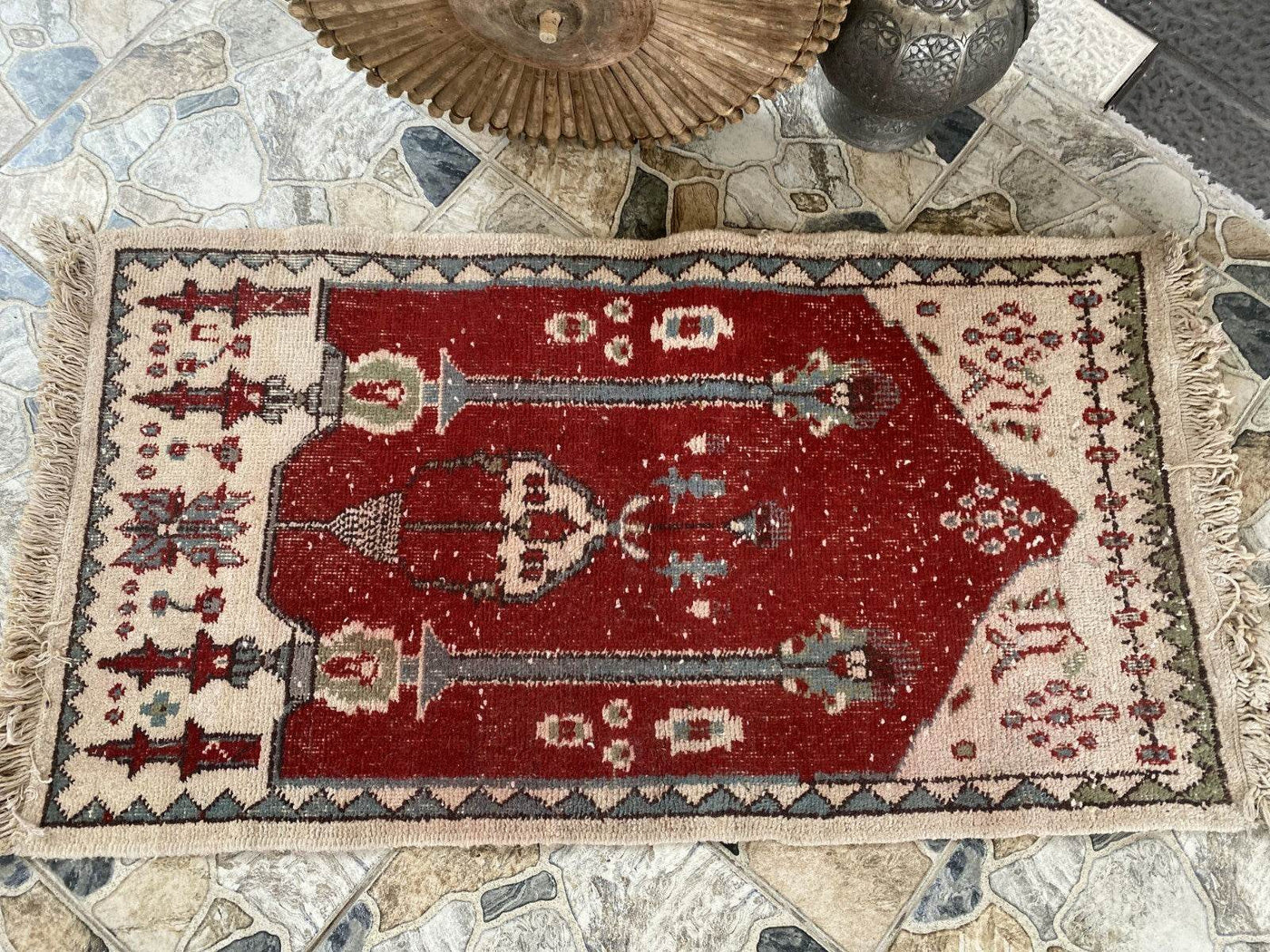 🕌 Vintage Turkish Small Prayer Rug | 2.26 x 4.10 ft | 1970s Hand-Knotted Wool | Rich Magenta & Tribal Motifs